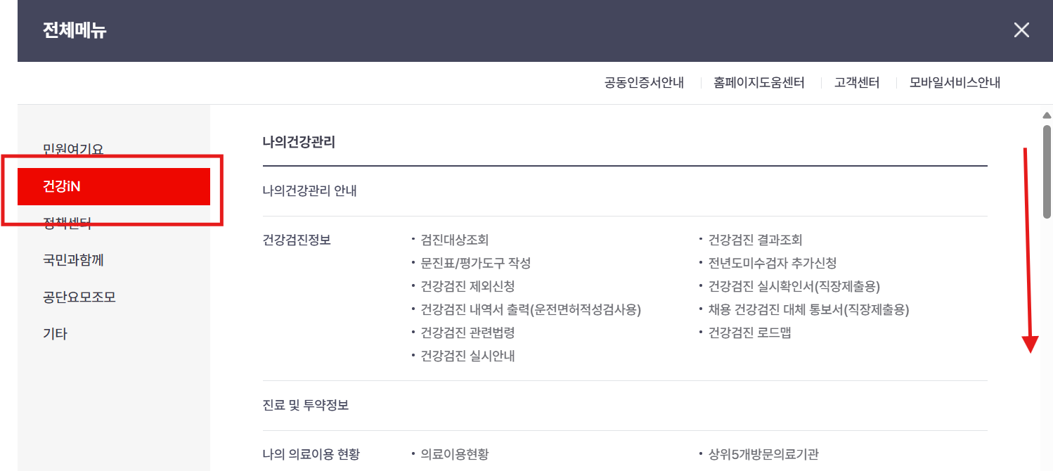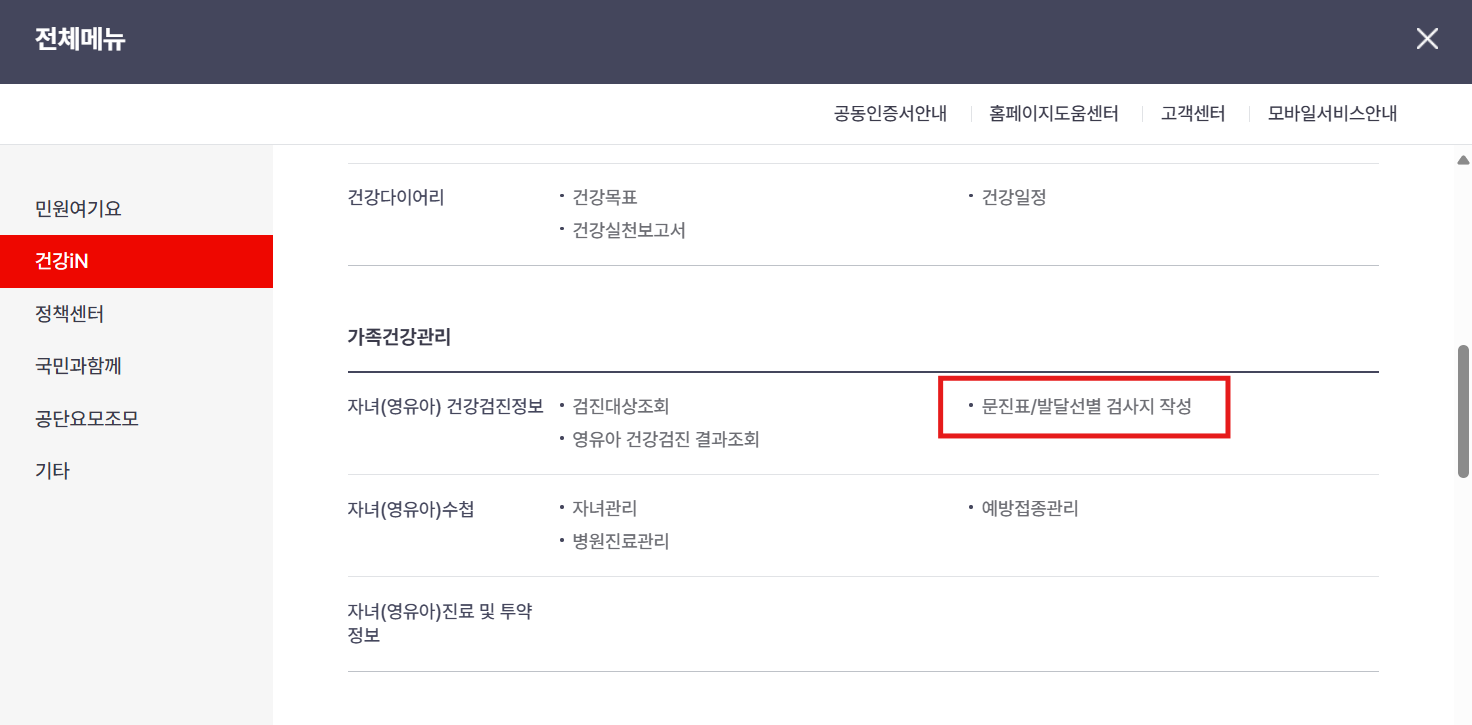4. 건강iN 카테고리에서 스크롤을 내려 가족건강관리 중 문진표/발달선별 검사지 작성을 클릭합니다.