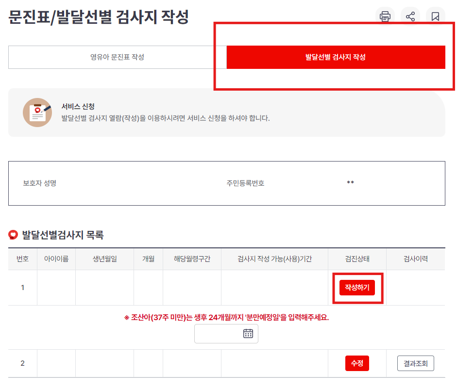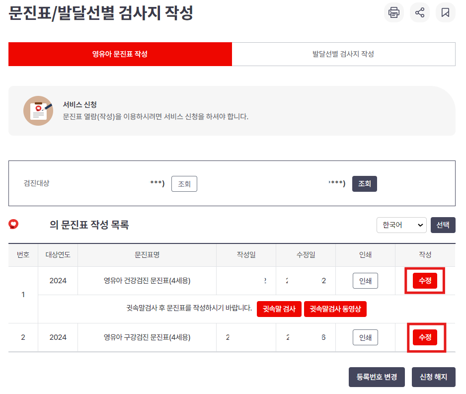 9. 문진표와 발달 선별검사지를 모두 작성하였다면 건강검진 기관에서 등록번호(작성자의 주민등록상 생일 4자리, ex) 생일 01월 01일인 경우 등록번호는 0101)로 조회가 가능하니 빠른 진행이 가능합니다. 👍