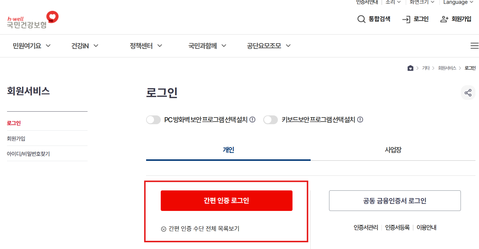 2. 개인으로 로그인 합니다(공동금융인증서나 간편로그인으로 로그인 가능해요)