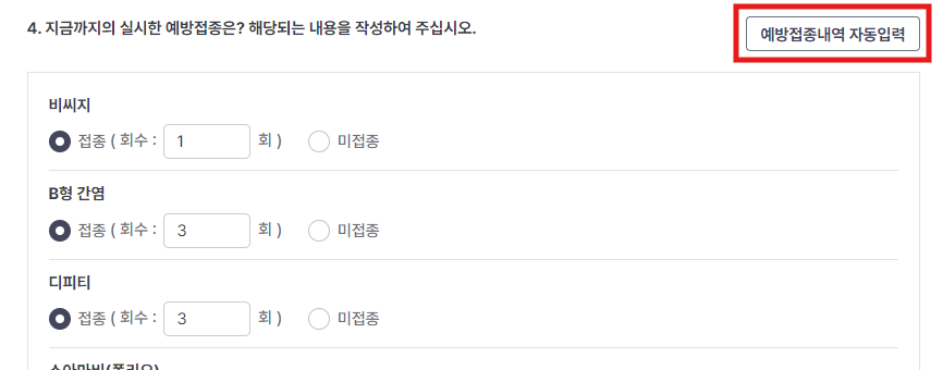 7. 기본 정보를 입력하고 영유아 건강검진 문진표를 작성 후 마지막 저장 버튼을 클릭하여 저장합니다. (예방접종 문항은 자동 입력 버튼을 클릭하면 자동으로 입력되어 편리하게 이용하실 수 있습니다.)
