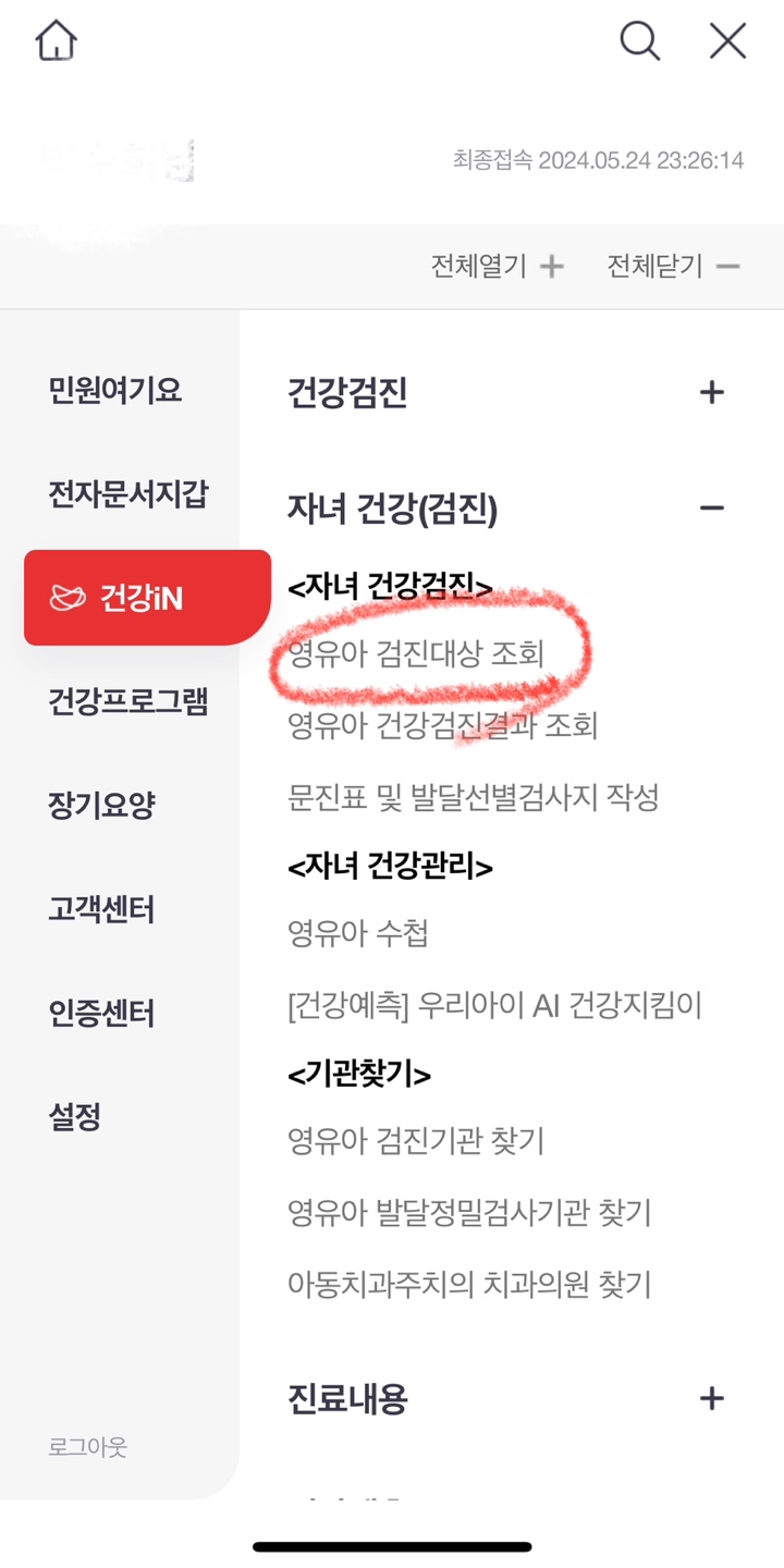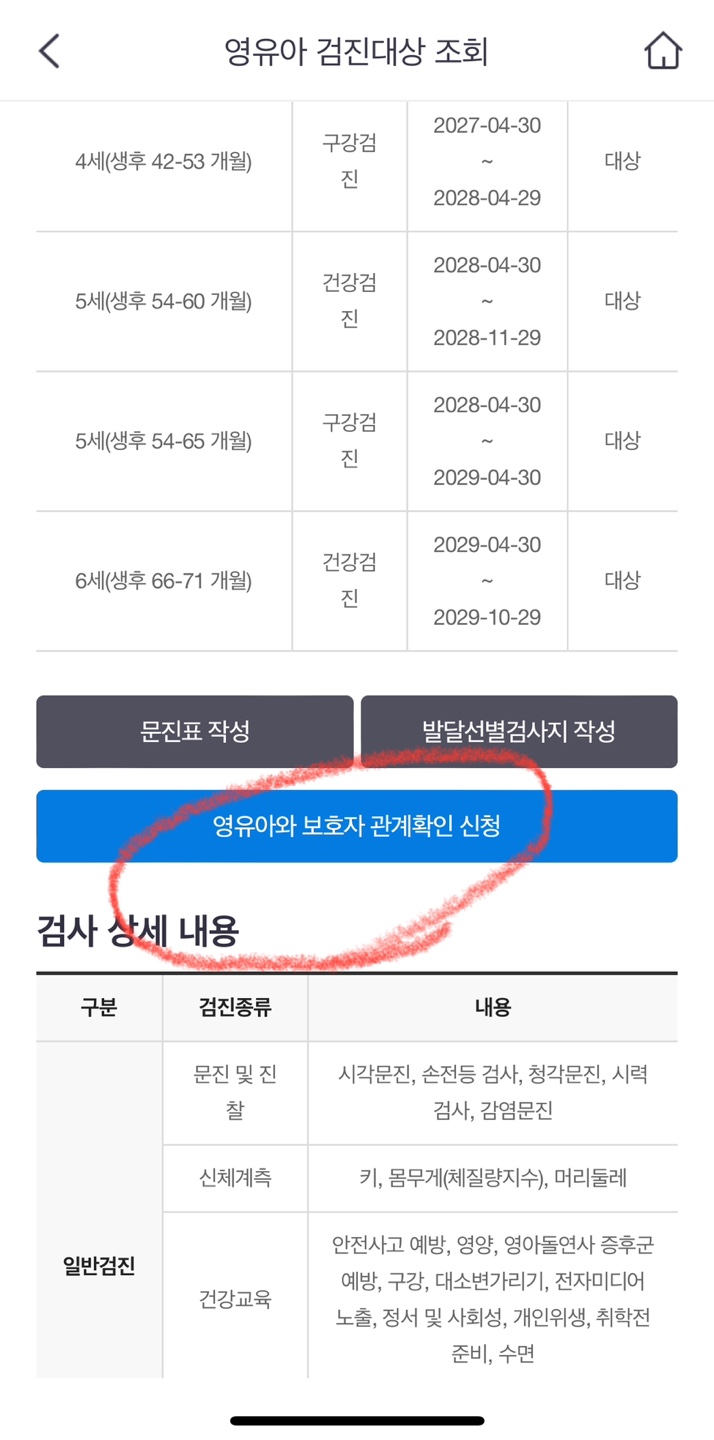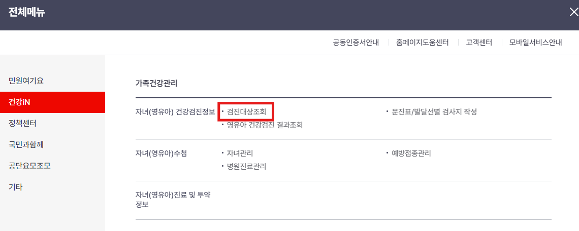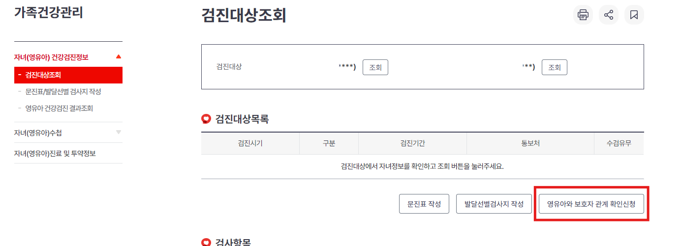 전체메뉴 > 건강iN > 가족건강관리 > 자녀(영유아) 건강검진정보 > '검진대상조회'메뉴에서 '영유아 보호자 관계확인 신청"