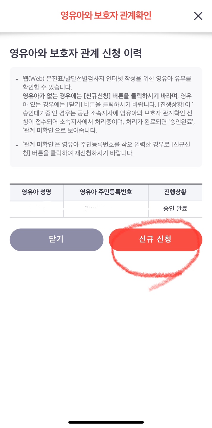 영유아 문진표를 작성하기 위해서 먼저 영유아 보호 관계 확인 신청을 먼저 진행해야 합니다.