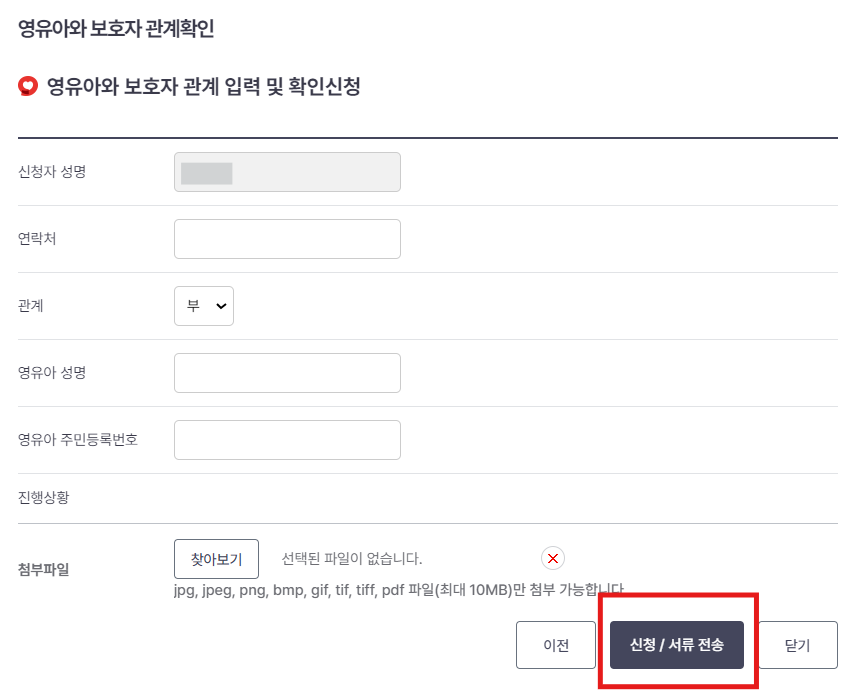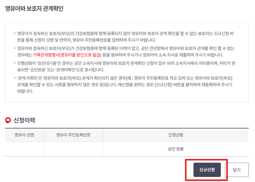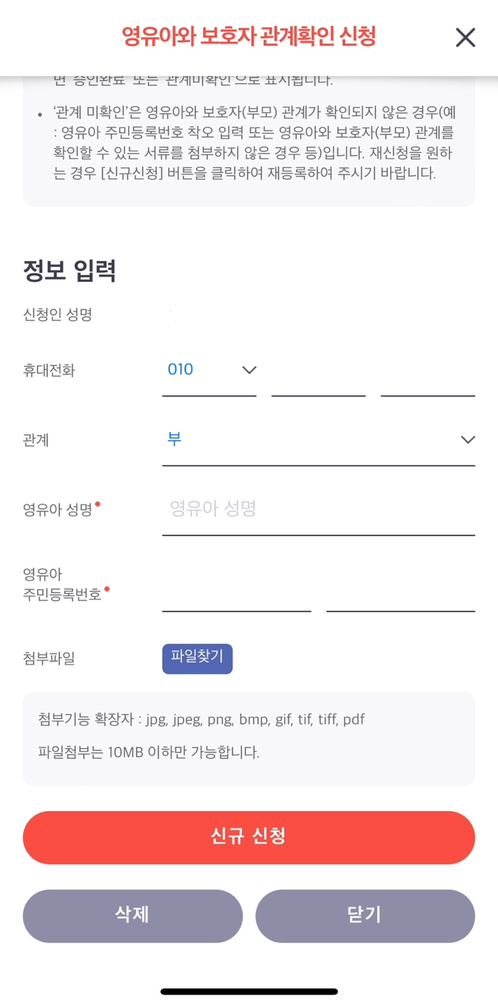 영유아 보호자 관계 입력 및 확인 신청시 공단 전산망에서 영유아와 보호자 관계를 확인할 수 없는 경우 가족관계증명서(영유아를 본인으로 발급)를 첨부파일에 첨부👌