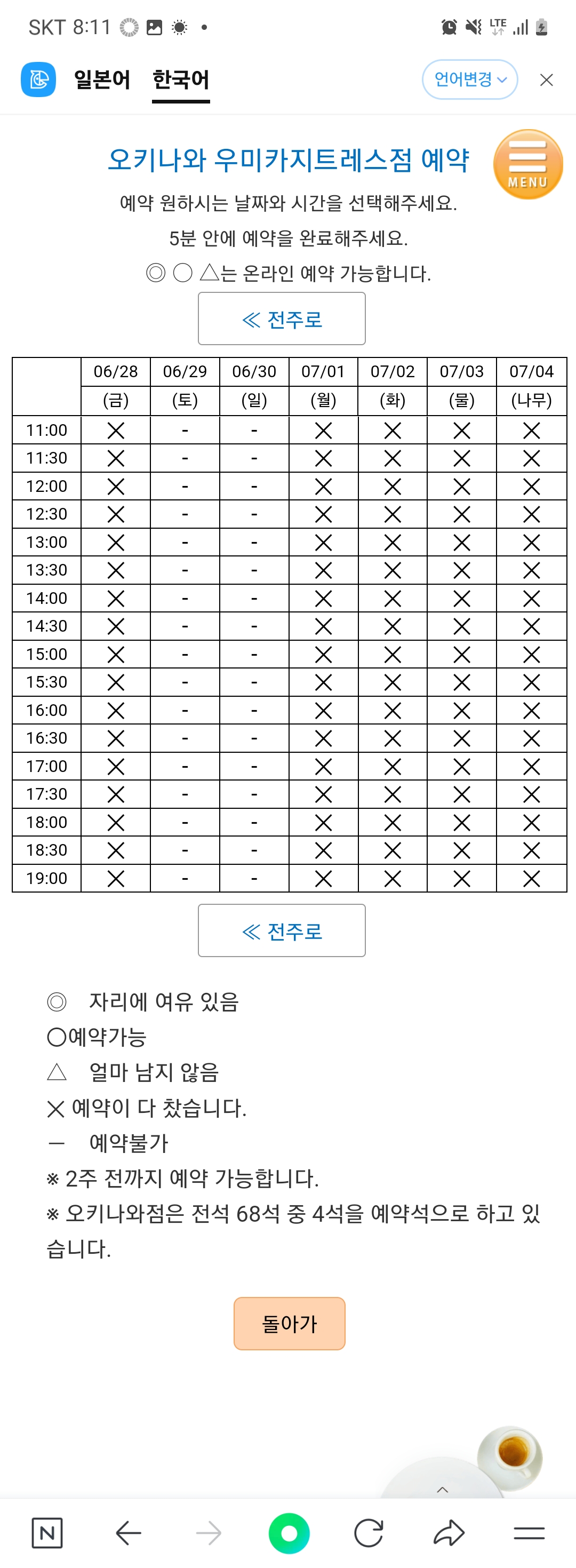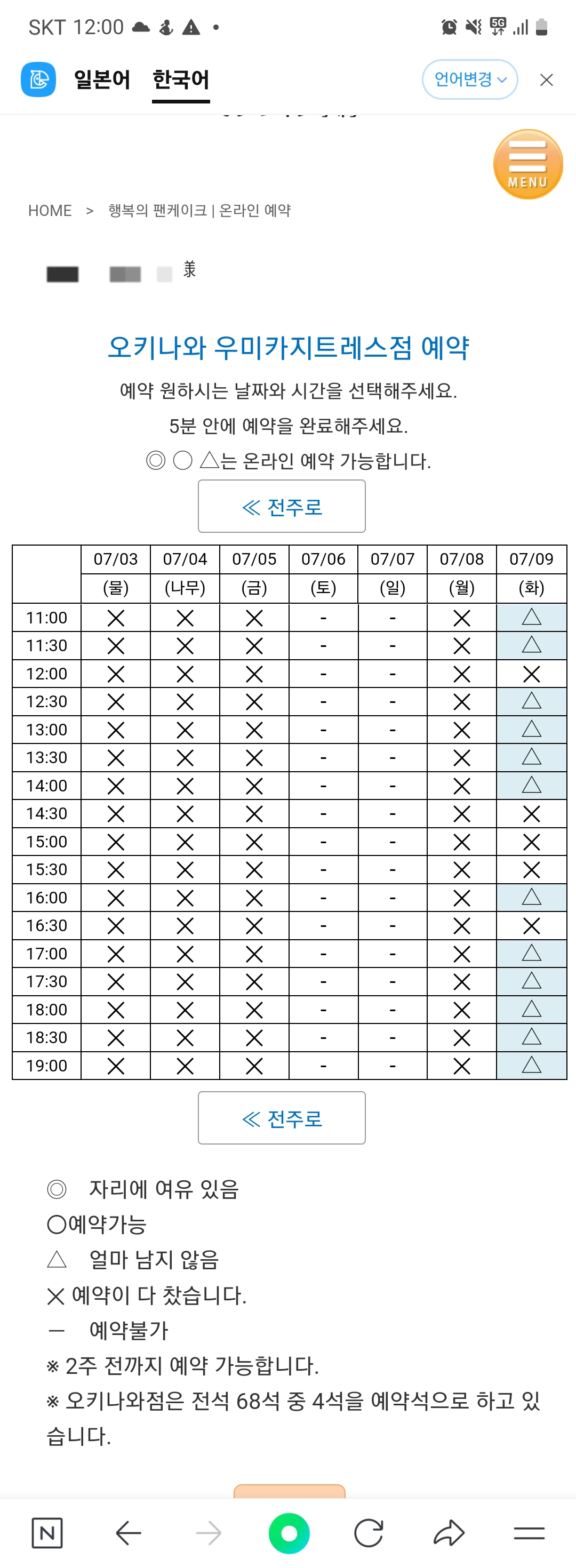 (매일 00:00시에 2주뒤 예약이 영업시간 우미카지테라스점의 경우 오전 11:00부터 30분 단위로 오픈이 됩니다.)