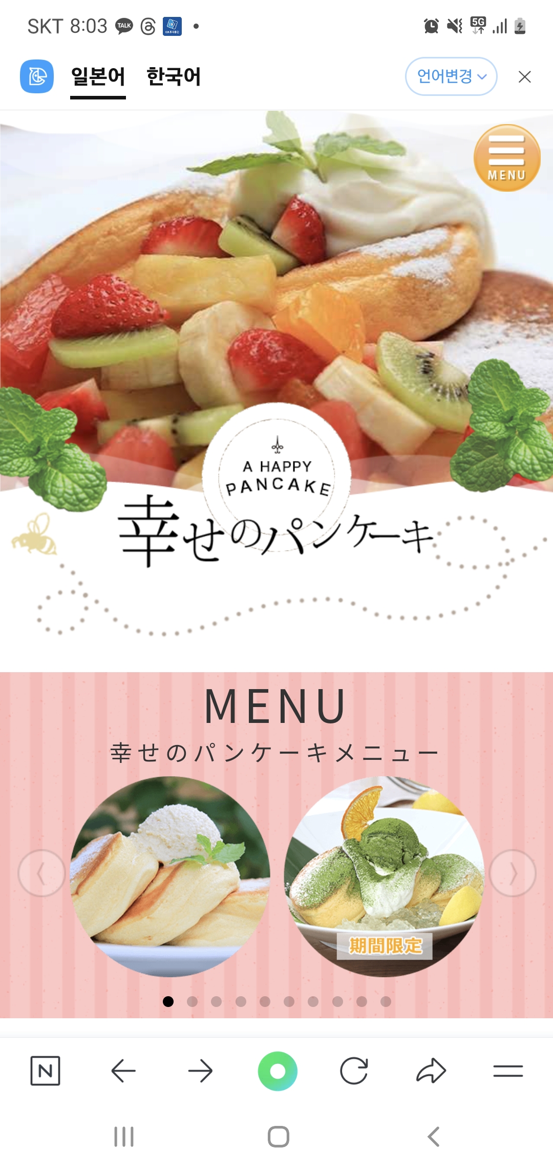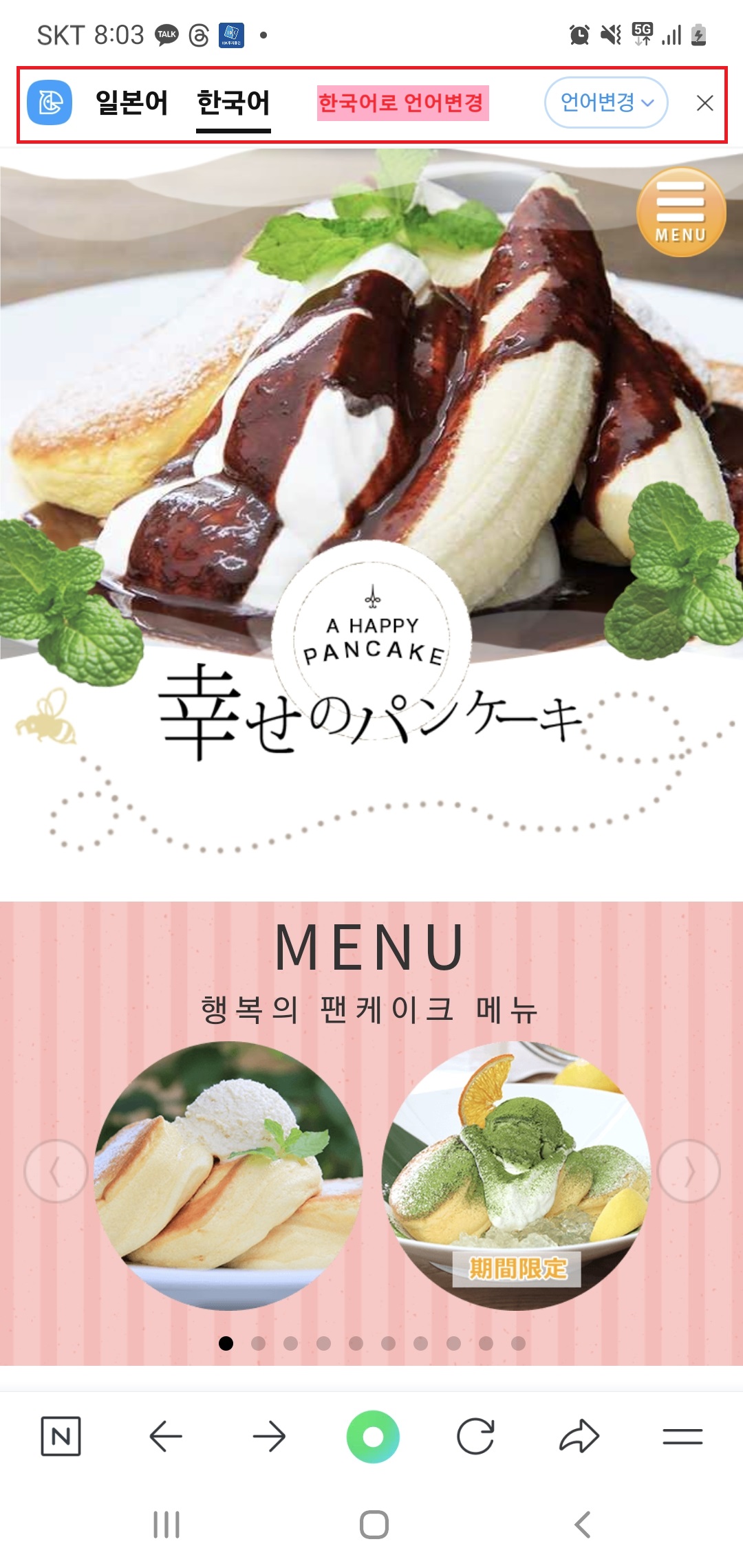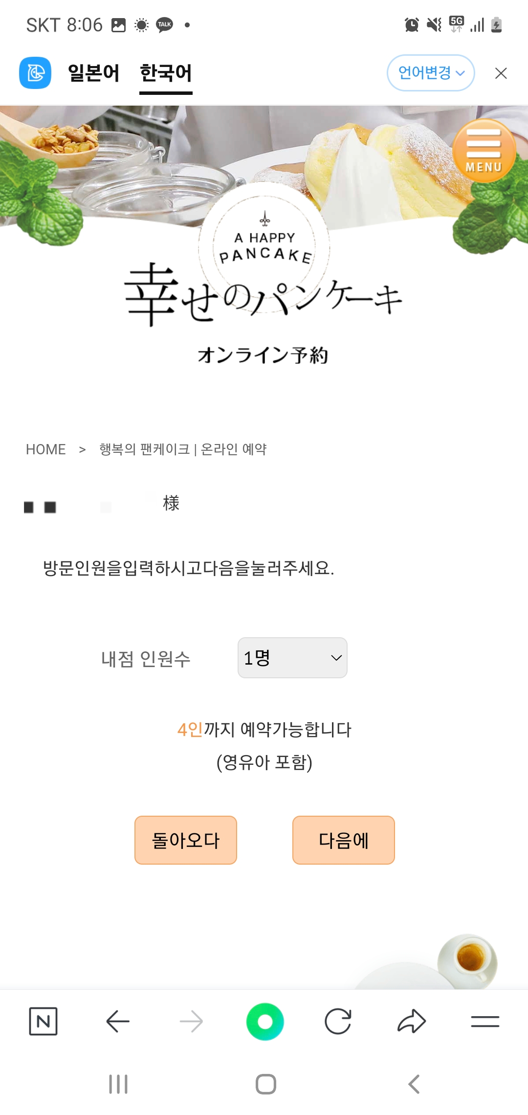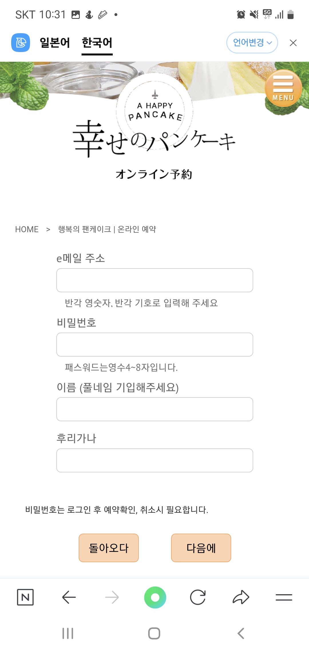 3. 파파고를 이용하여 한국어로 언어변경 후 시아와세노 팬케이크 사이트 회원가입을 합니다.