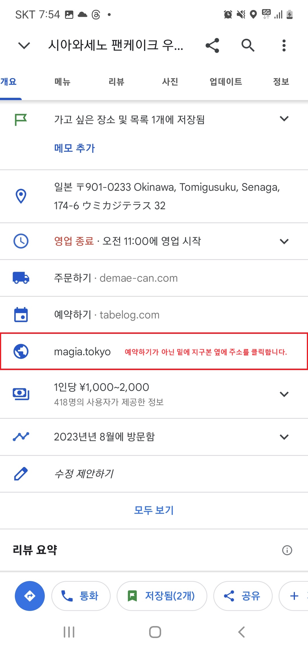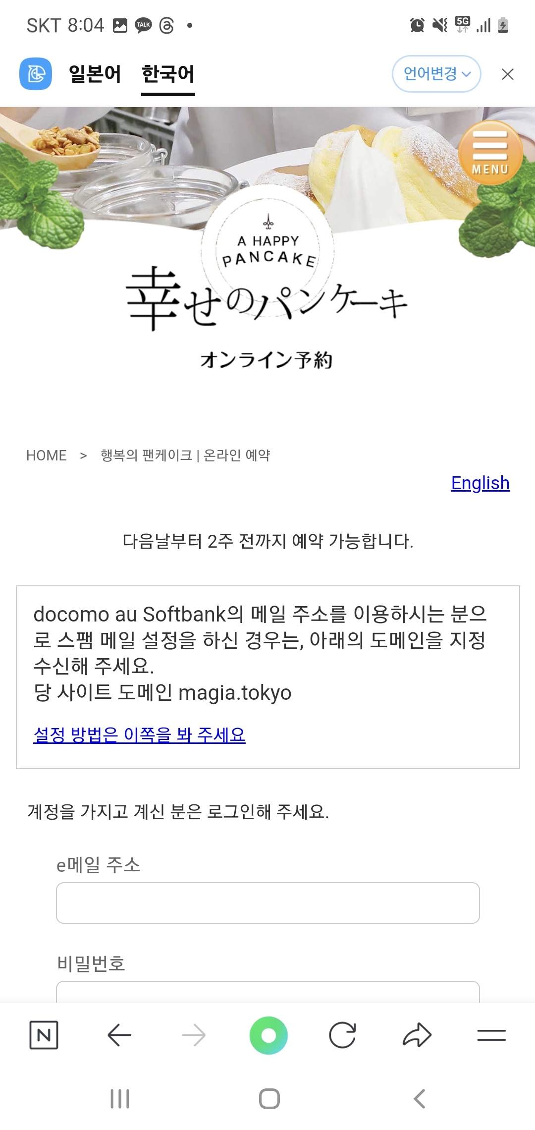2. 구글지도 옆에 예약하기가 아닌 밑에 지구본 옆에 magia.tokyo를 눌러 웹사이트에 접속합니다. 사이트에 접속하시면 아래 그림처럼 시아와세노 팬케이크 일본어 사이트로 접속이 됩니다.