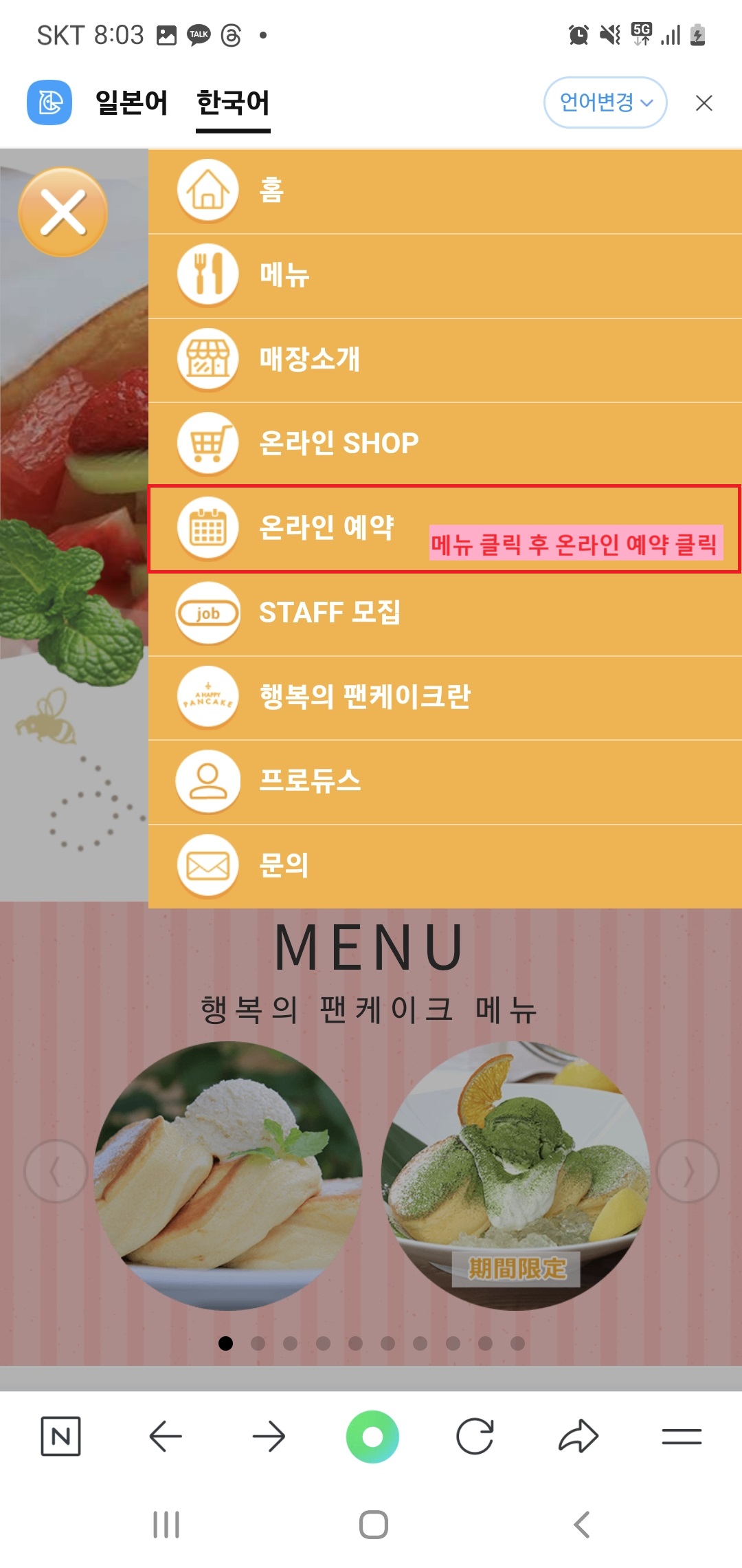 4. 회원가입을 하셨다면 상단에 메뉴 버튼을 클릭하시면 예약하기 항목을 찾으실 수 있을거에요. 예약하기를 클릭하시고 로그인해 주시면 됩니다.