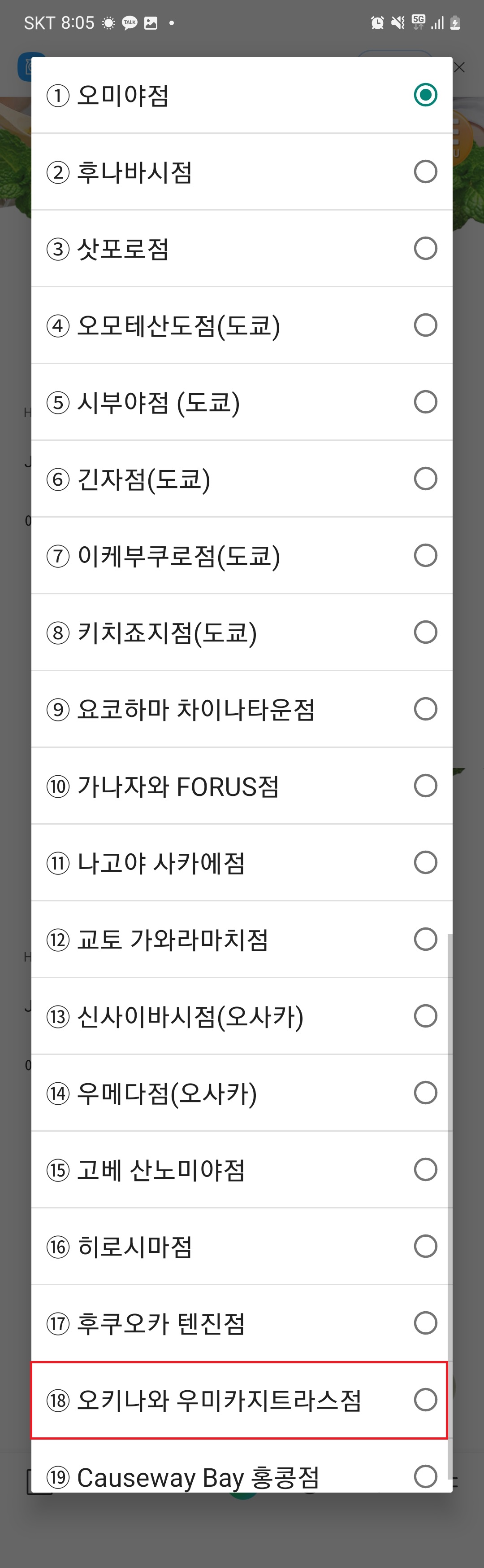 5. 로그인을 하시면 시아와세노 팬케이크의 여러 지점을 확인할 수 있습니다. 탱탱이네는 18번 오키나와 우미카지테라스점을 선택하였습니다.