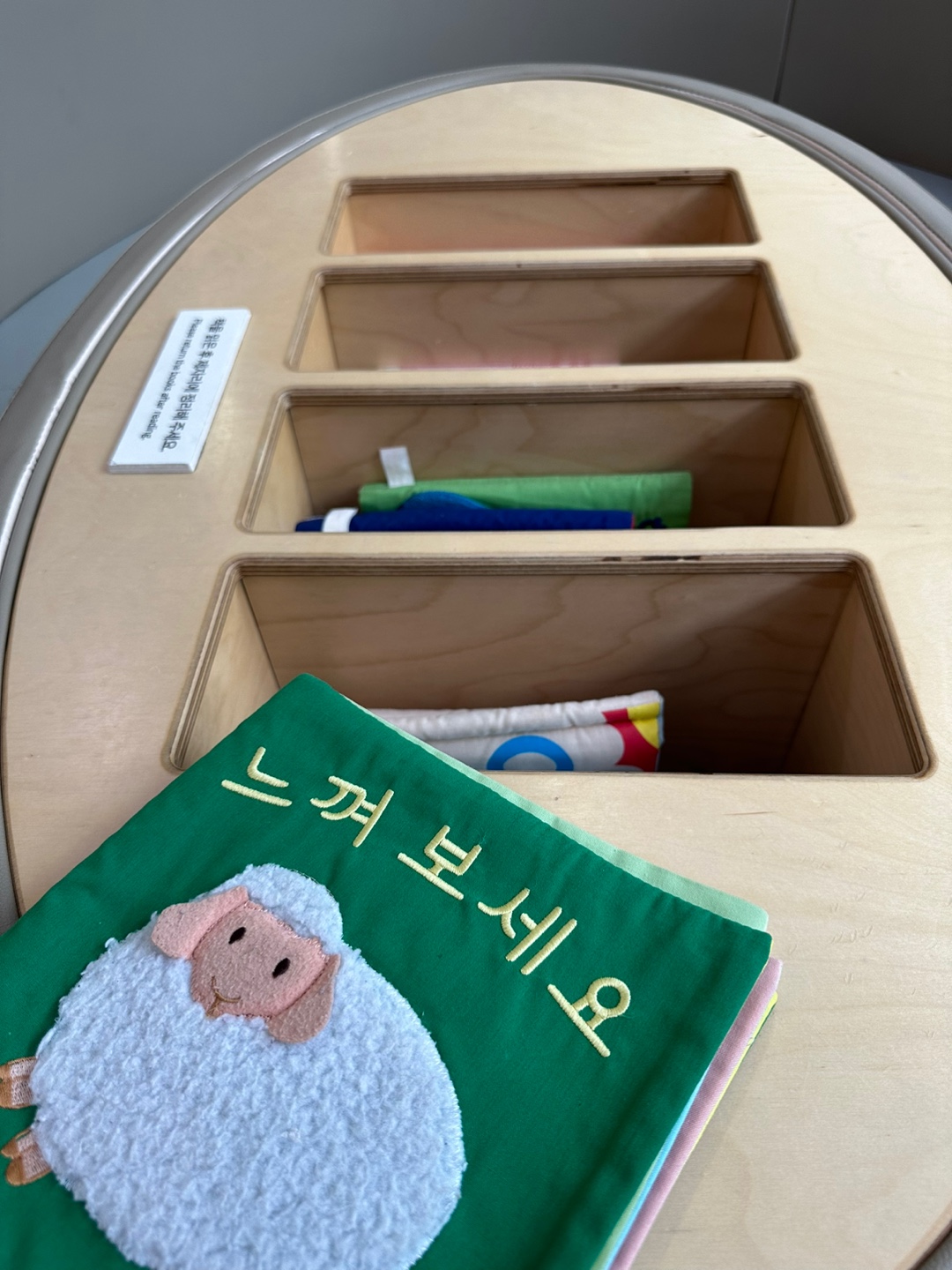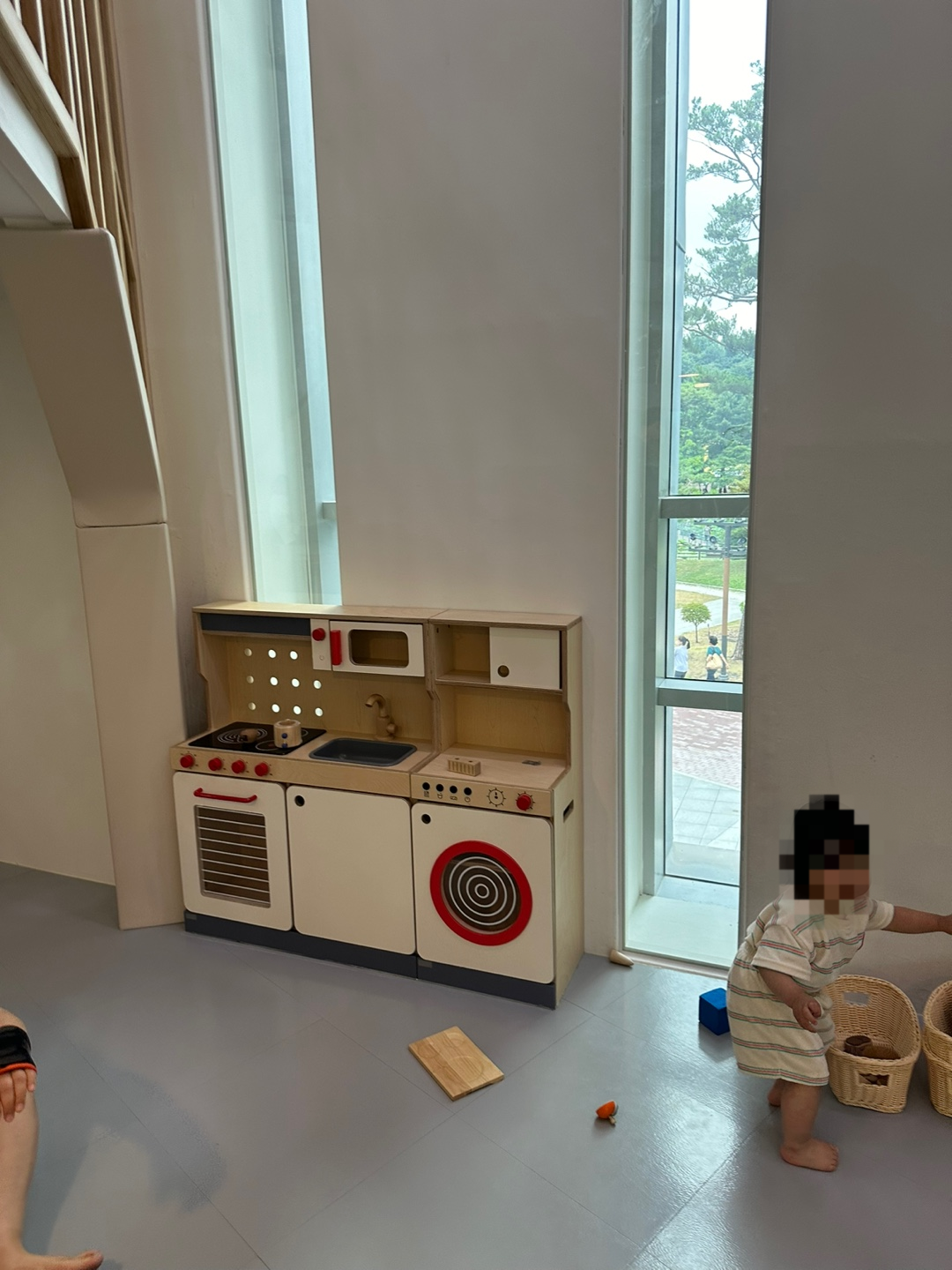 신발은 보관함에 넣어두고 들어가면 되는데, 바닥이 키즈카페처럼 폭닥한 바닥은 아니지만 작은 탱이는 여기저기 열심히 기어 다녔답니다 ㅎㅎㅎ 전체적으로 모두 우드로 되어 있고, 아가들 위한 소근육 발달 놀이나 촉감책, 주방놀이 등이 소소하게 준비되어 있어요!!
