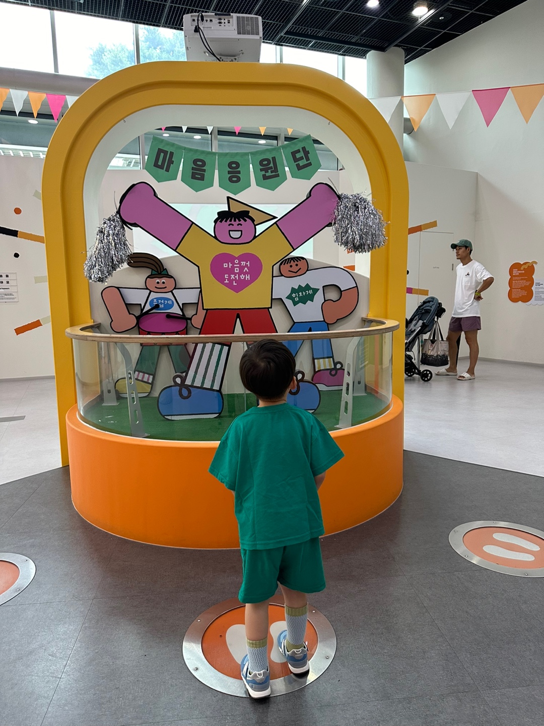 서울상상나라는 지하 1층부터 지상 3층까지 아이들이 흥미를 가질 만한 다양한 체험들로 꽉꽉 채워져 있어요!!👍👍 1층 전시장 입구로 입장해서 오른쪽으로는 "모두를 응원해"라는 주제로 기획전이 마련되어 있어요. 아이들이 좋아하는 사진도찍고 프린트해서 전시하기부터 콩주머니 던지기, 하이파이브 게임, 걱정날리기 등 재미있는 요소들이 많이 있었어요!!