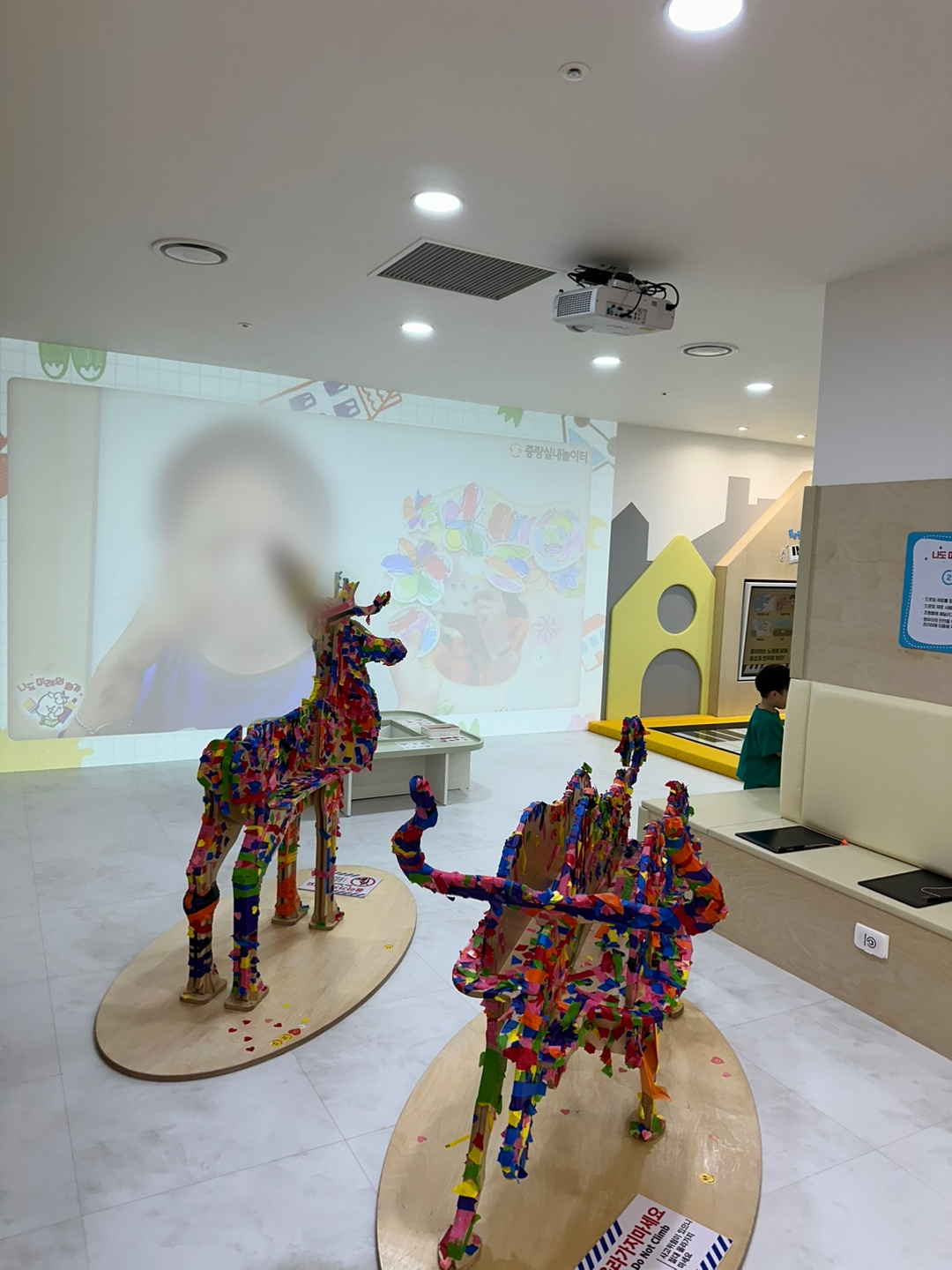 입구 쪽에는 마킹테이프로 사슴 조형물을 꾸미기와 끼적이기를 할 수 있는 공간이 있고, 블록 놀이나 편백놀이 같은 소근육과 촉감놀이를 할 수 있는 공간, 캠핑 존으로 꾸며진 역할 놀이 공간, 암벽 등반, 트램펄린 같은 대근육을 발달시킬 수 있는 다양한 공간들이 골고루 잘 배치되어 있었어요. 안쪽으로는 핌 프로젝트를 이용한 게임과 총싸움 게임도 있어서 마지막까지 잘 놀다가 왔어요.👍👍