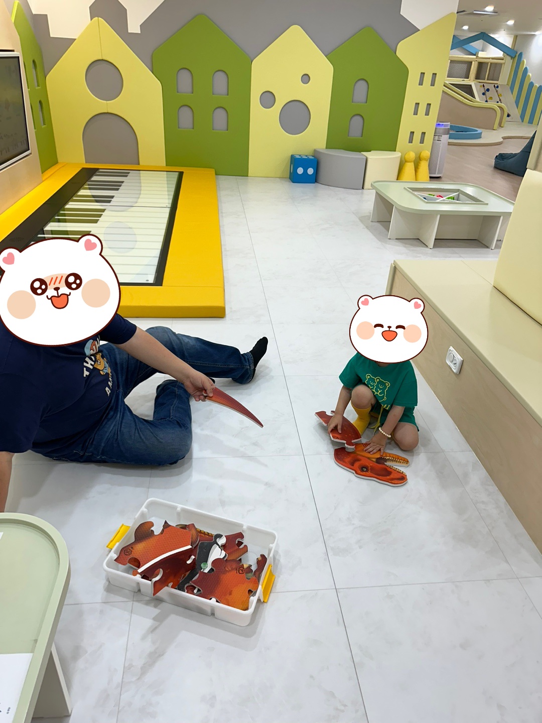 큰 탱이는 여기저기 대형 키즈카페도 자주 다녔었는데, 조금 일찍 도착해서 사람이 없는 확 트인 공간이 무서웠는지 안 들어가겠다고 해서 당황했어요.😲😲 하지만 들어가자마자 대형 공룡 퍼즐에 푹 빠져서 2시간 동안 정신없이 놀다 왔답니다.