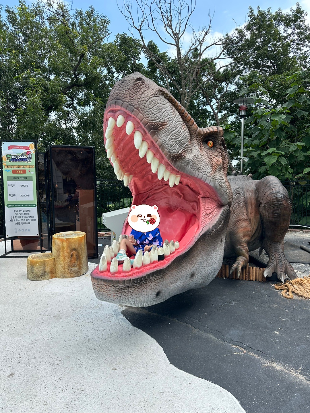 주차장이 꽤 넓은 편이라 주차하기 어렵지 않았어요!! 주차장 입구부터 커다란 공룡이 맞이해 주니 큰 탱이는 입구부터 아주 흥분 상태였어요.🤣 야외에 전시되어 있는 공룡들 한 마리 한 마리에게 정성스럽게 인사하고, 너무 더우니 몬스터리움 안으로 얼른 도망가 봅니다. 요즘 날씨가 덥고 습하다 보니 몬스터리움 입구에서부터 동물들 냄새가 좀 나기는 해요.
