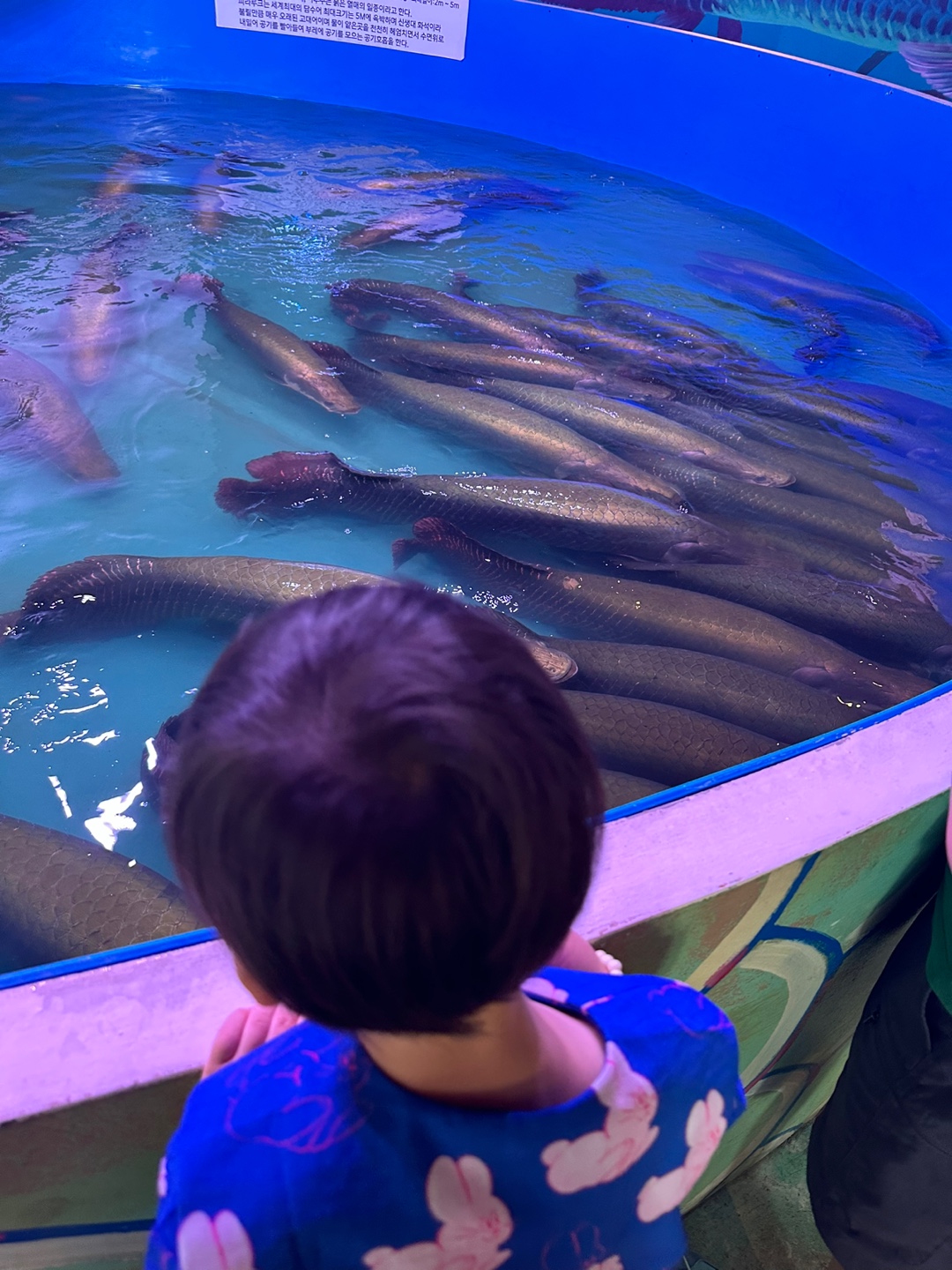 몬스터리움에는 신기한 물고기들이 정말 많았어요. 그중에서도 어린 피라루크에게 먹이 주기는 몬스터리움에서만 볼 수 있는 이색 이벤트였어요! 원래는 주말에만 하는 이벤트인데, 이날은 이용객이 많아서 특별히 먹이 주기 이벤트를 진행했습니다.