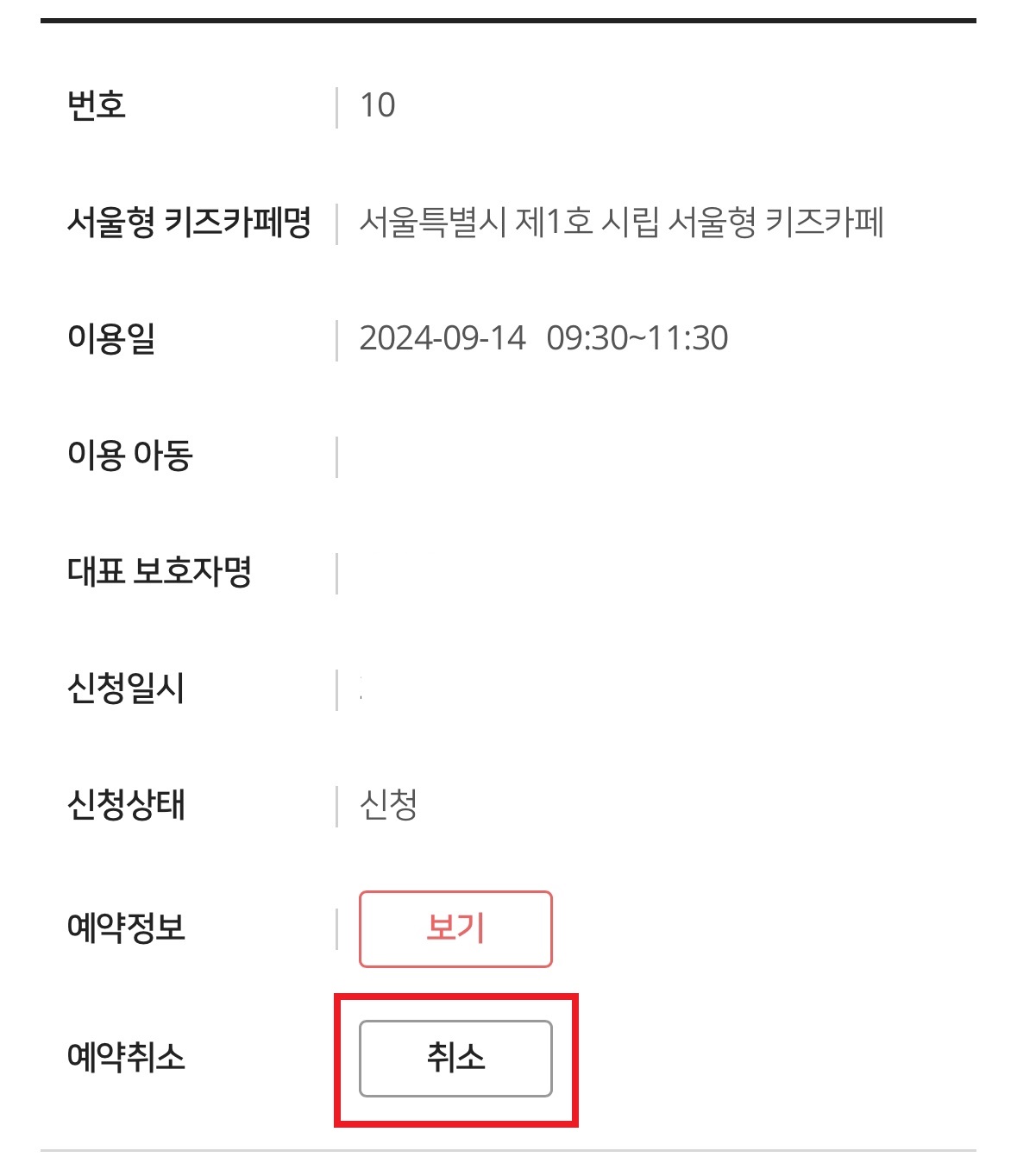 마이페이지클릭 > 키즈카페 예약 신청 내역 클릭 > 예약 취소 클릭