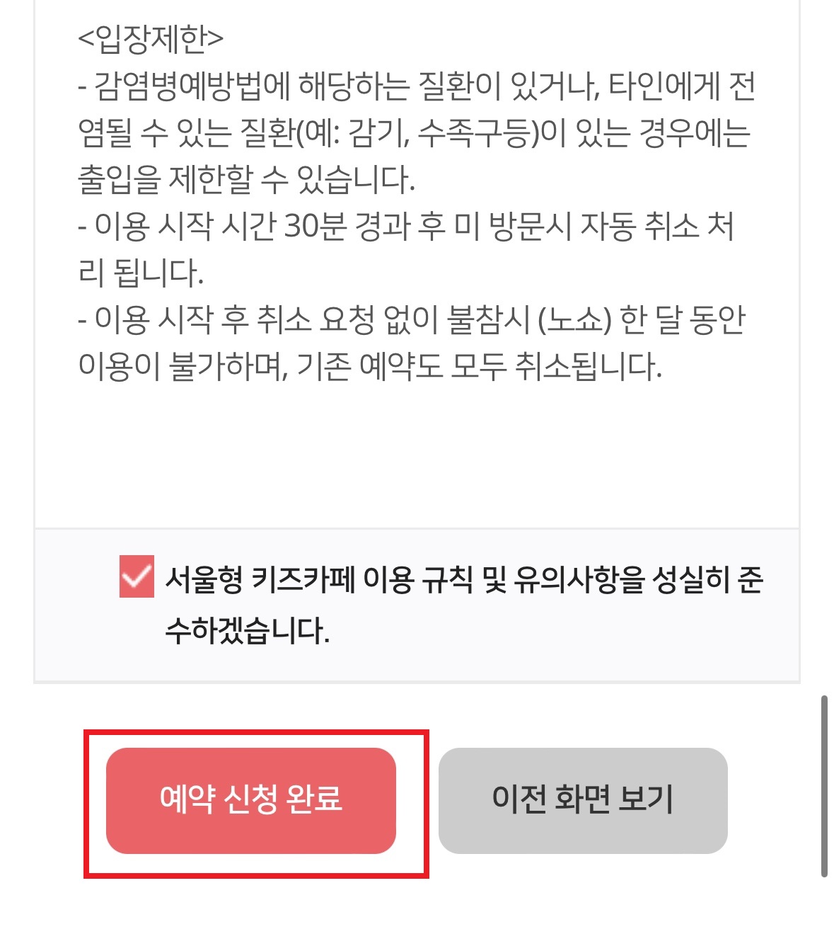 동의 절차 3군데 모두 체크 > 예약 신청 완료 클릭 > 예약 신청 완료 폐이지 확인
