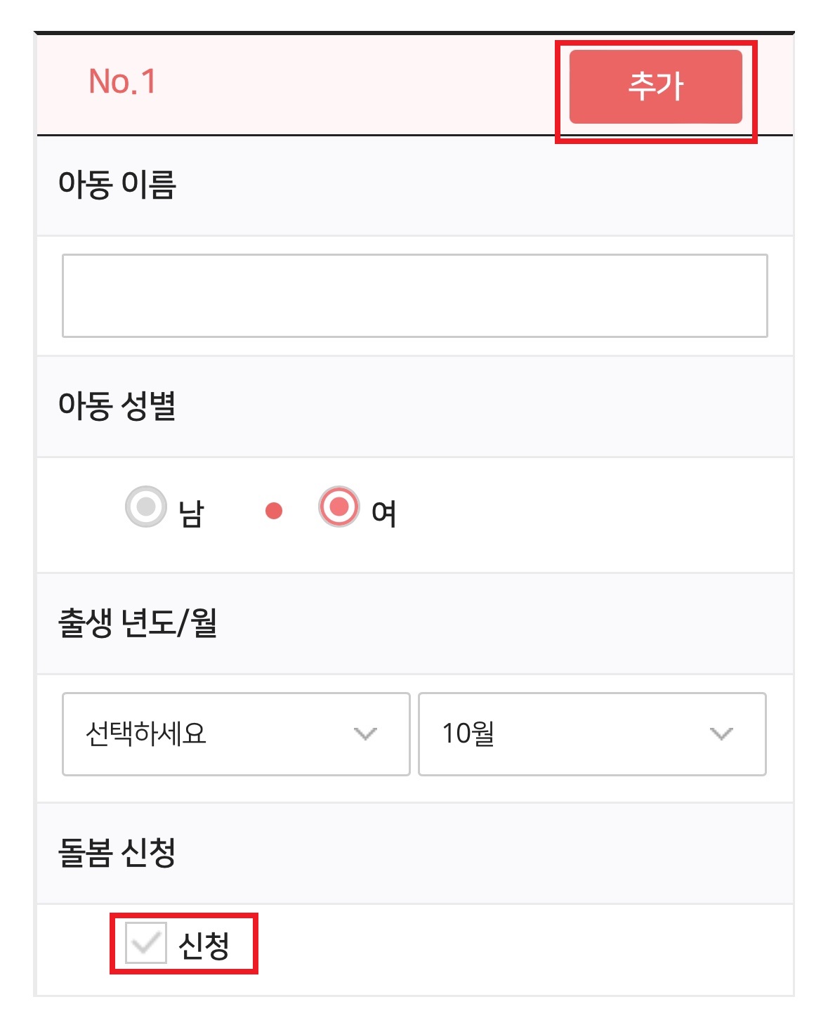 신청자 정보 확인 > 대표 보호자 정보 작성(신청자와 같을 경우 신청자 정보와 동일 체크) > 동반 보호자 수 작성(지점별로 신청 가능 보호자 인원이 다를 수 있으니 꼭 확인하세요!!) > 이용 아동 정보 작성(이용 하는 아이 정보 모두 추가해 주셔야 해요, 36개월 이상 아이들은 돌봄 신청도 가능해요!!)