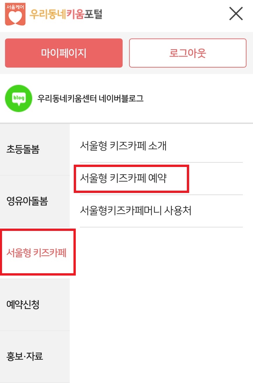 우리동네키움포털 접속 > 오른쪽 상단 줄세개 클릭 > 로그인 > 서울형 키즈카페 > 서울형 키즈카페 예약