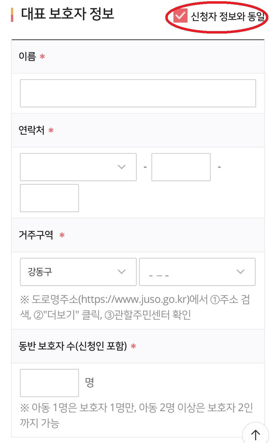 신청자 정보 확인 > 대표 보호자 정보 작성(신청자와 같을 경우 신청자 정보와 동일 체크) > 동반 보호자 수 작성(지점별로 신청 가능 보호자 인원이 다를 수 있으니 꼭 확인하세요!!) > 이용 아동 정보 작성(이용 하는 아이 정보 모두 추가해 주셔야 해요, 36개월 이상 아이들은 돌봄 신청도 가능해요!!)