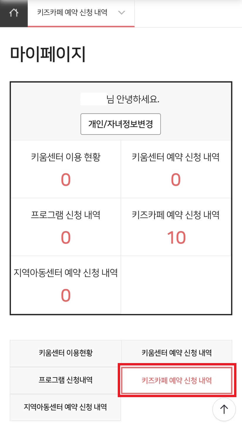 마이페이지클릭 > 키즈카페 예약 신청 내역 클릭 > 예약 취소 클릭