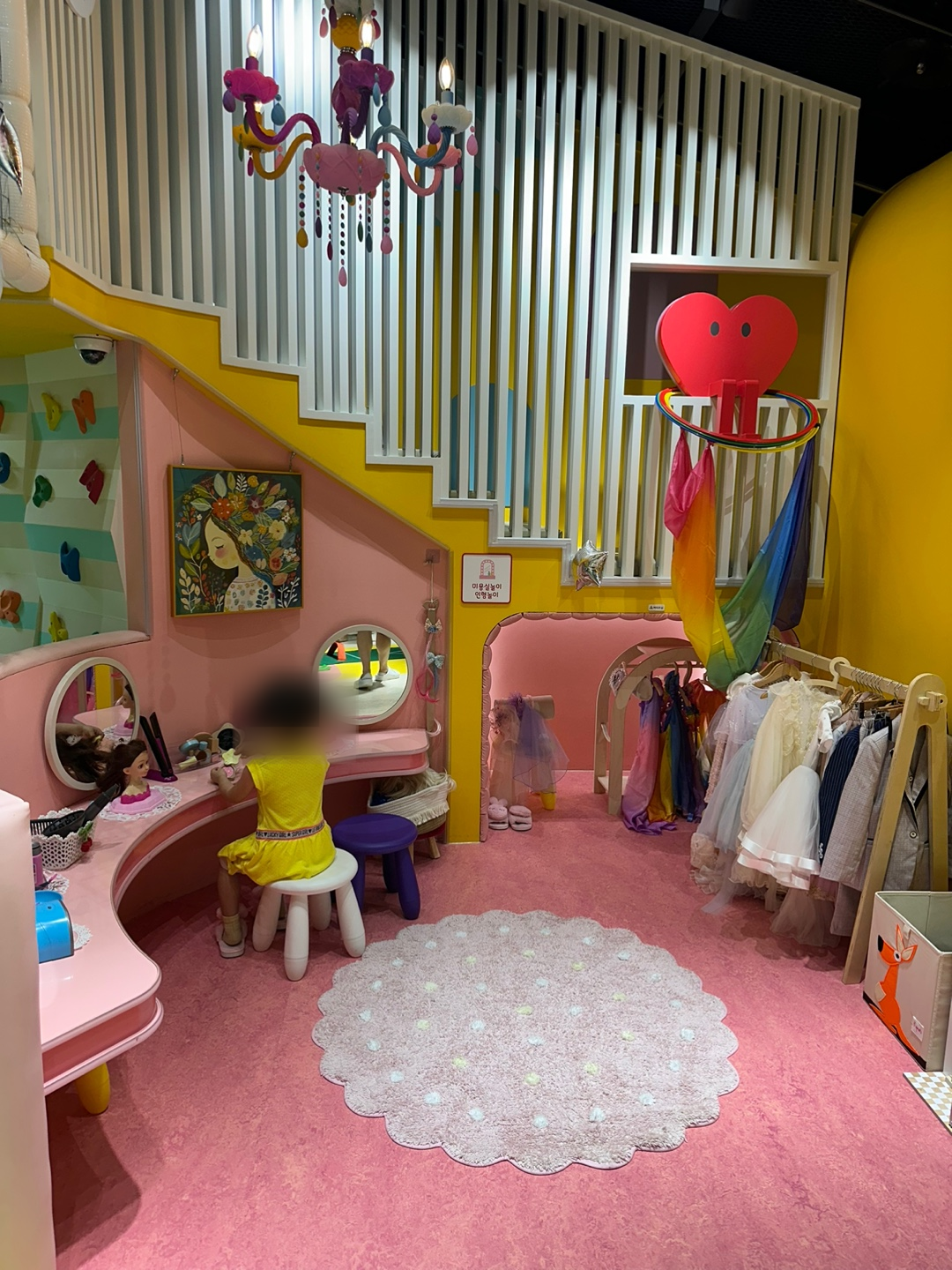 유아존은 공주님들이 좋아할 만한 드레스룸부터 역할 놀이 공간까지 잘 꾸며져 있고, 큰 탱이가 좋아하는 자동차 같은 장난감부터 아이들의 체력을 쏙 빼놓기 좋은 정글짐이 다양하게 연결되어 있었어요!! 😆😆