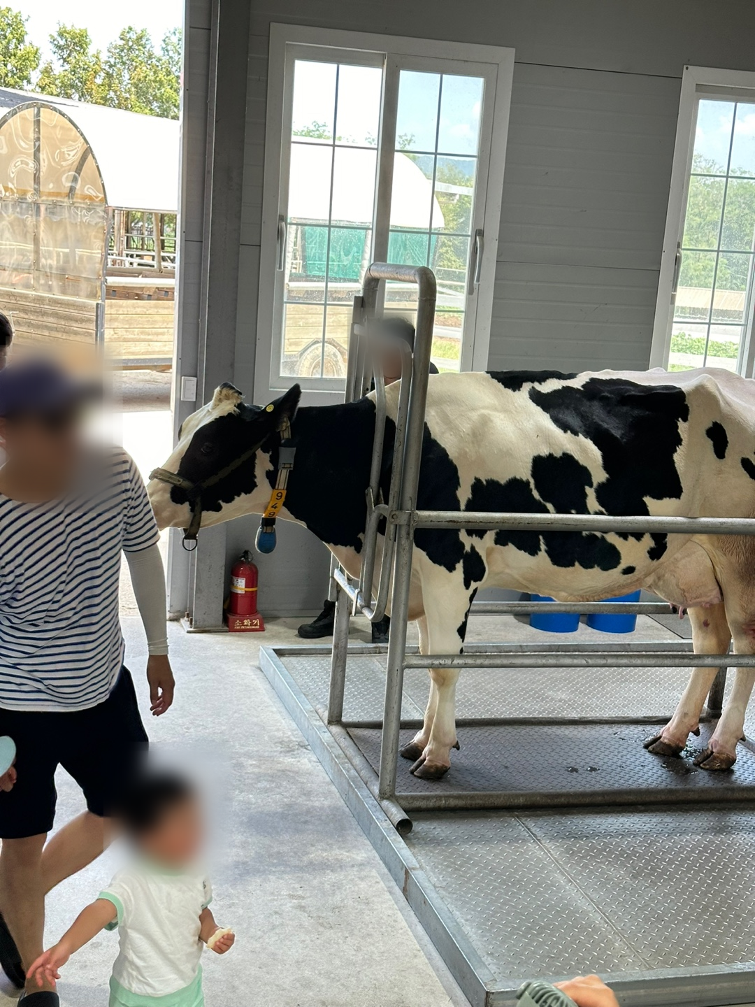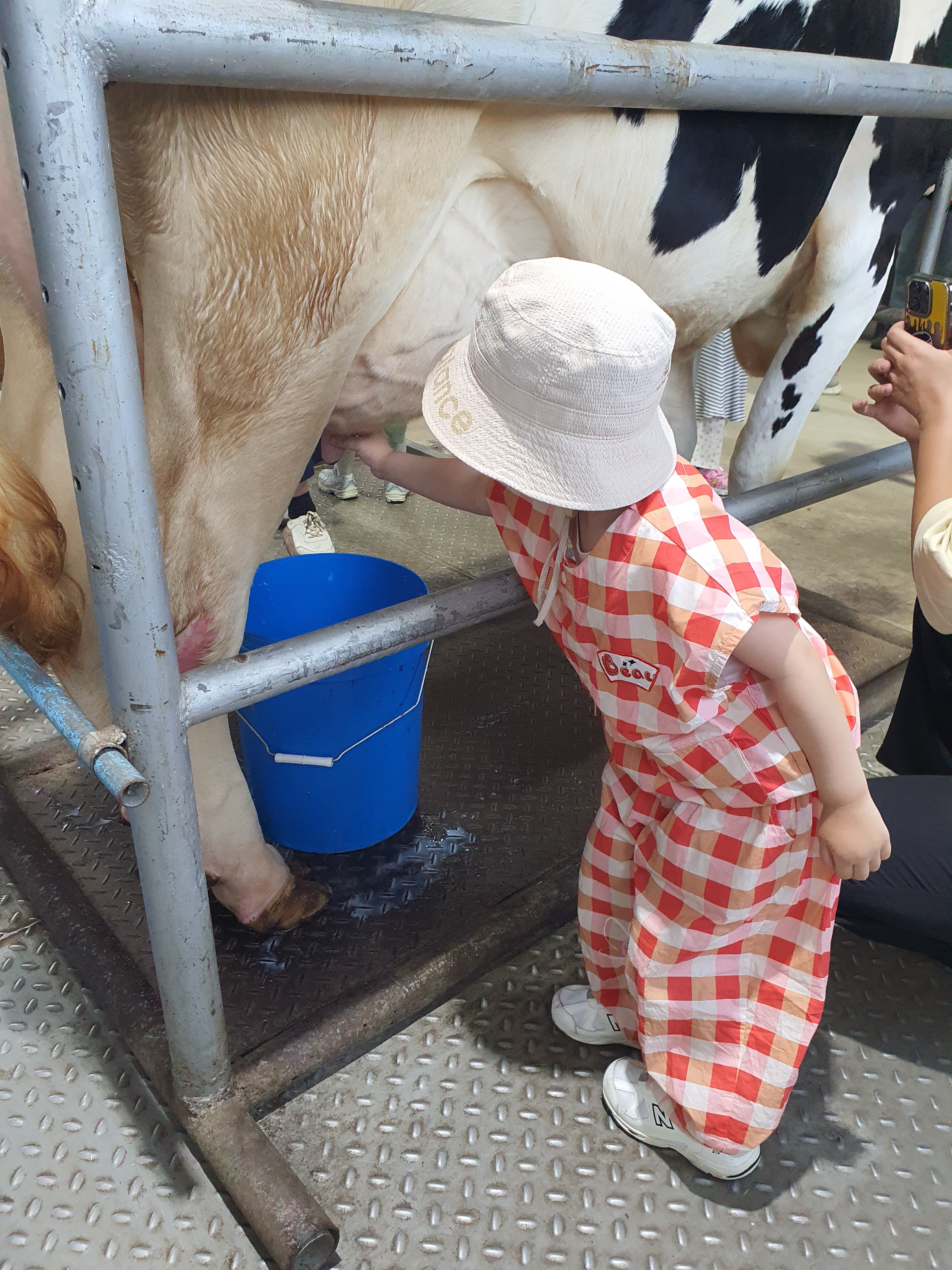성체인 젖소는 옆에서 보니 생각보다 정말 컸고, 젖도 너무 따뜻해서 진짜 신기한 경험이었어요!! 큰 탱이도 신기했는지 처음에는 조금 무서워하다가 조심스럽게 젖을 짜보더라구요!!