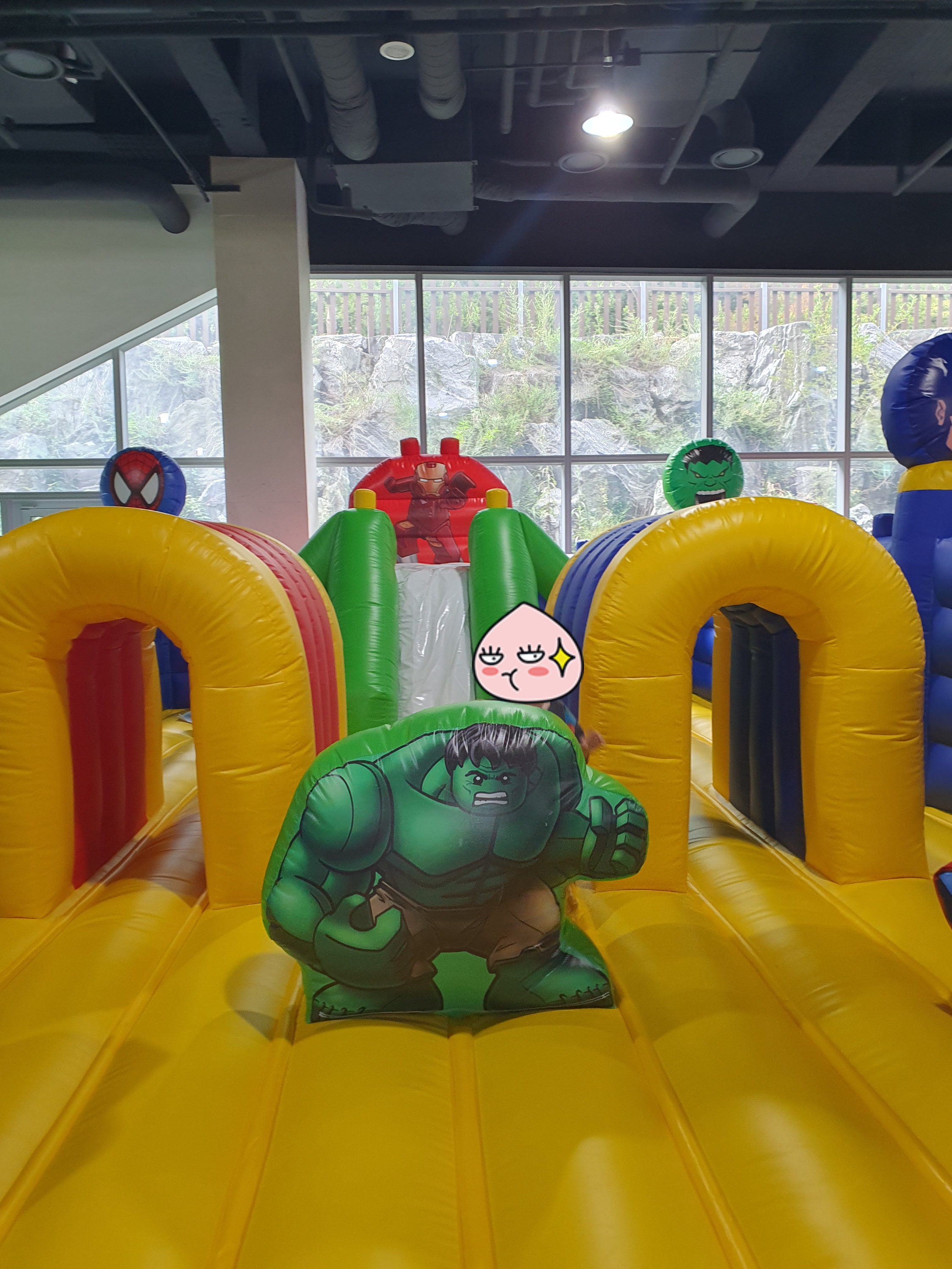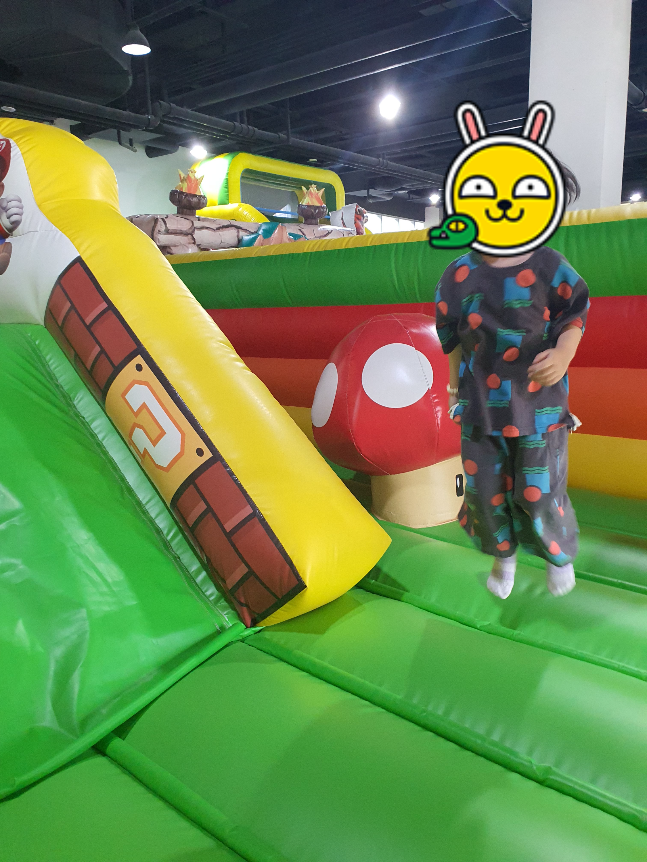 에어바운스는 공간 한쪽에 다양한 주제로(슈퍼마리오, 공룡, 마블 등) 바운스들이 설치되어 있어 아이들이 신발을 벗고 자유롭게 이용할 수 있게 구성되어 있었어요.우리의 큰 탱이는 이 바운스, 저 바운스 옮겨다니며 거의 1시간 이상을 뛰어다니더라고요.