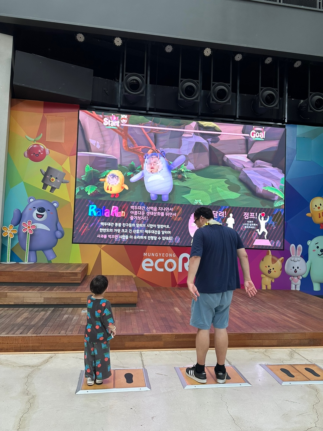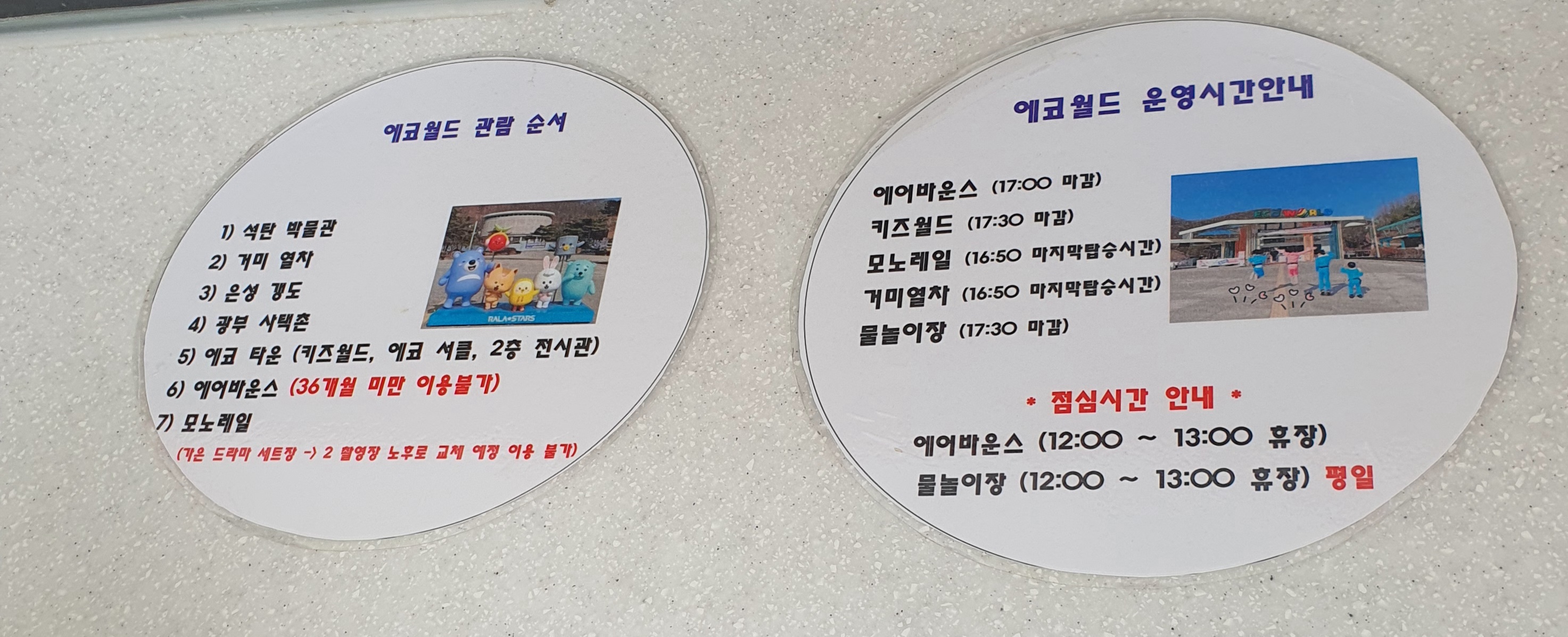 에코월드에 입장하시면 정면에 에코월드 마스코트들과 사진찍고 뒤로 석탄 박물관이 보여요!! 추천 코스는 석탄박물관 > 거미열차 > 은성갱도 > 광부 사택촌 > 에코타운(키즈월드, 에코서클 등) > 에어바운스(36개월 미만 이용불가) > 모노레일(사극촬영 세트장) 이지만 큰 탱이가 모노레일 정류장으로 뛰어갑니다...🤣🤣