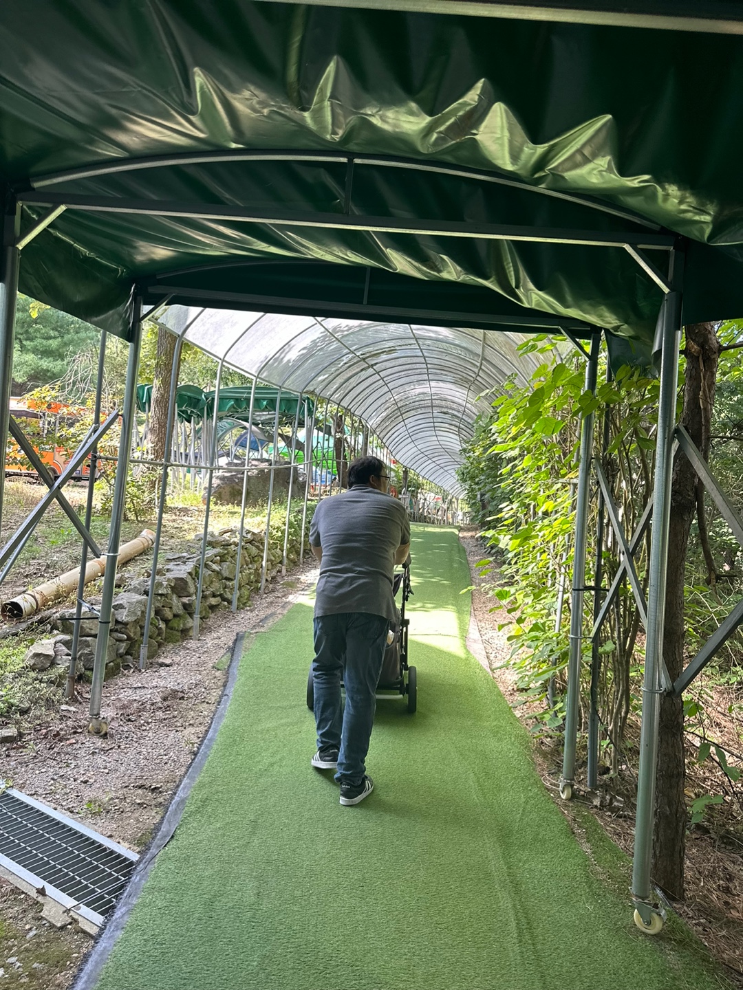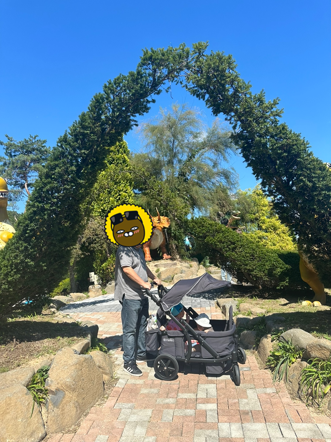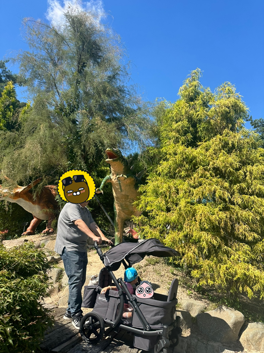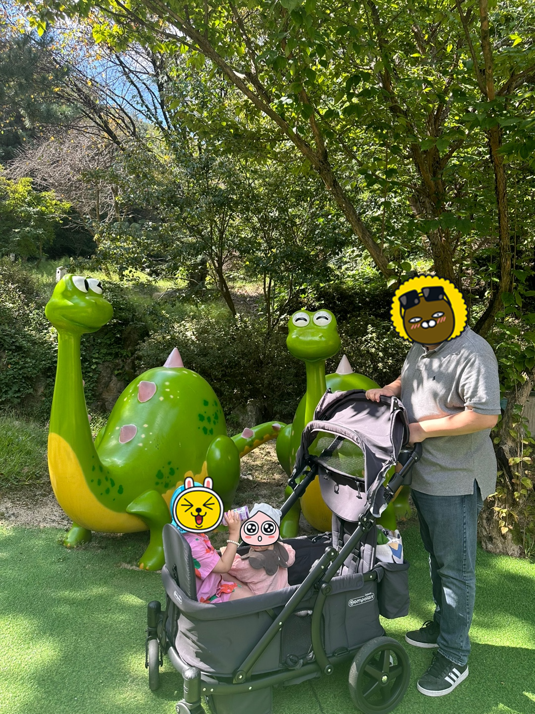 탱탱이네는 걷기 싫어하는 큰 탱이를 위해 웨건을 거져왔는데, 수목원이라 그런지 꽤 오르막도 있었어요. 덕분에 탱탱파파는 운동을 제대로 했네요. 아주 아빠 건강을 생각하는 효자죠.😘😘 관람로를 따라가다 보면 초록 나무들 사이로 공룡들이 꽤 많이 전시되어 있고 소리도 나요!! 작은 탱이는 공룡 소리가 무서웠는지 울음이 터졌네요. 그 와중에도 어서가자며 공룡한테 연신 손을 흔들며 빠빠이 해줍니다.🤣😂 나무가 많아서 그늘진 곳은 선선하니 시원하고 나무 사이로 보이는 푸른 하늘은 정말 예뻐서 저절로 힐링이 되는 공간이네요!!