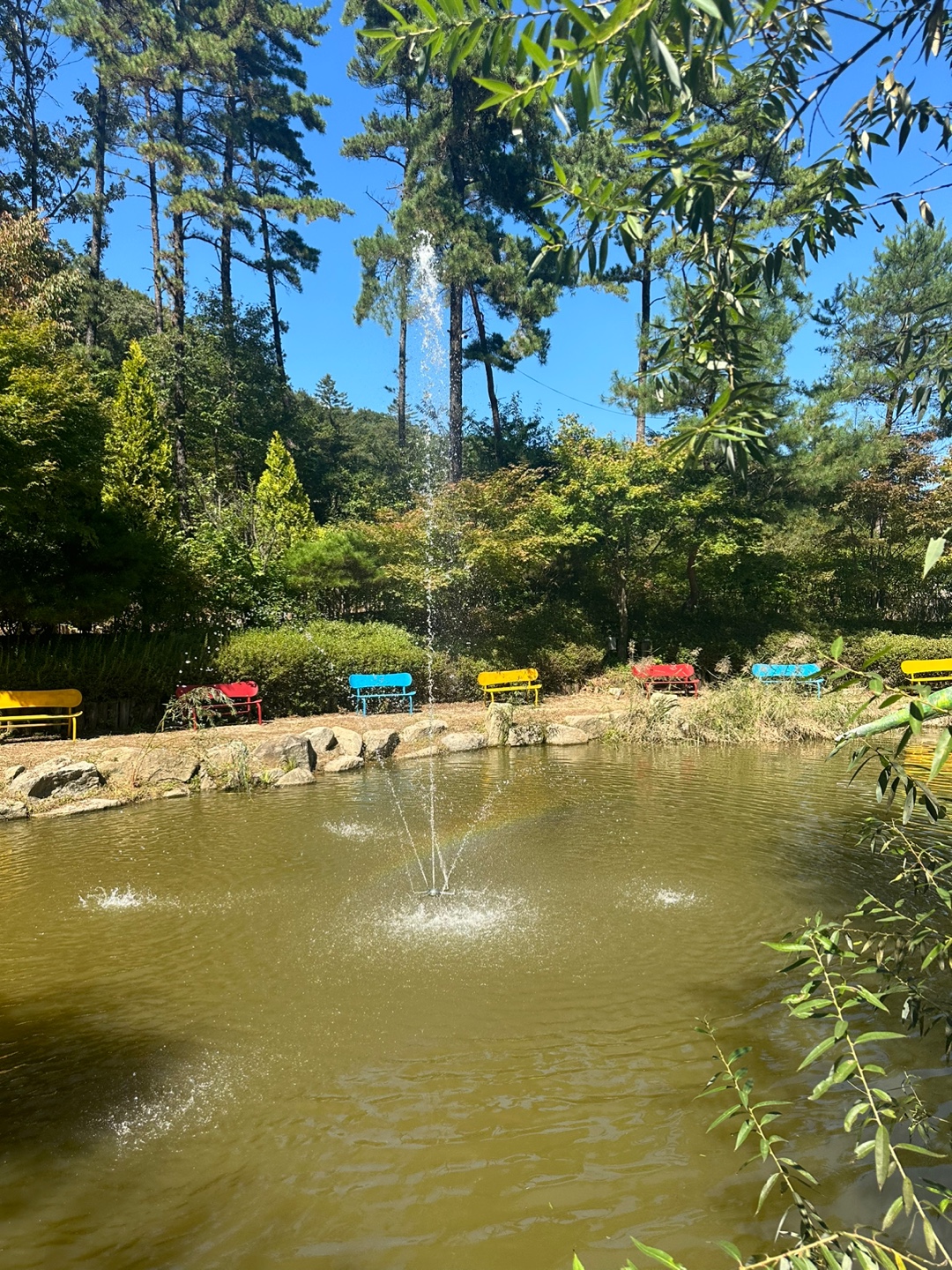그렇게 물고기를 구경을 하고 있는데, 연못 데크 위에 진짜 사마귀가 나타났어요!!! 자연 친화적 수목원이라 그런지 살아 있는 사마귀를 보는 것도 정말 오랜만이네요!! 데크 한가운데 얼어 있던 사마귀는 친절한 관광객분이 안전한 곳으로 옮겨 주셨어요.😃😃 마지막으로 연못에 있는 작은 분수에서는 작은 무지개도 볼 수 있었어요.