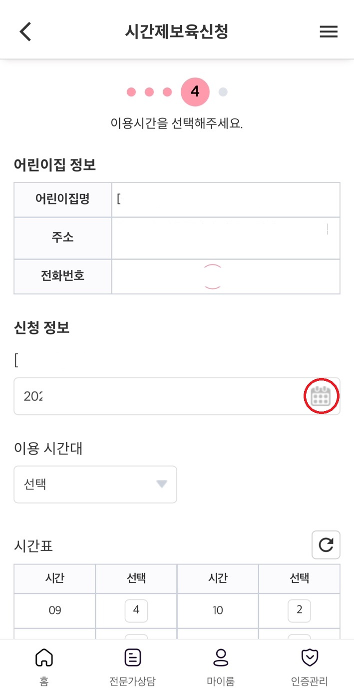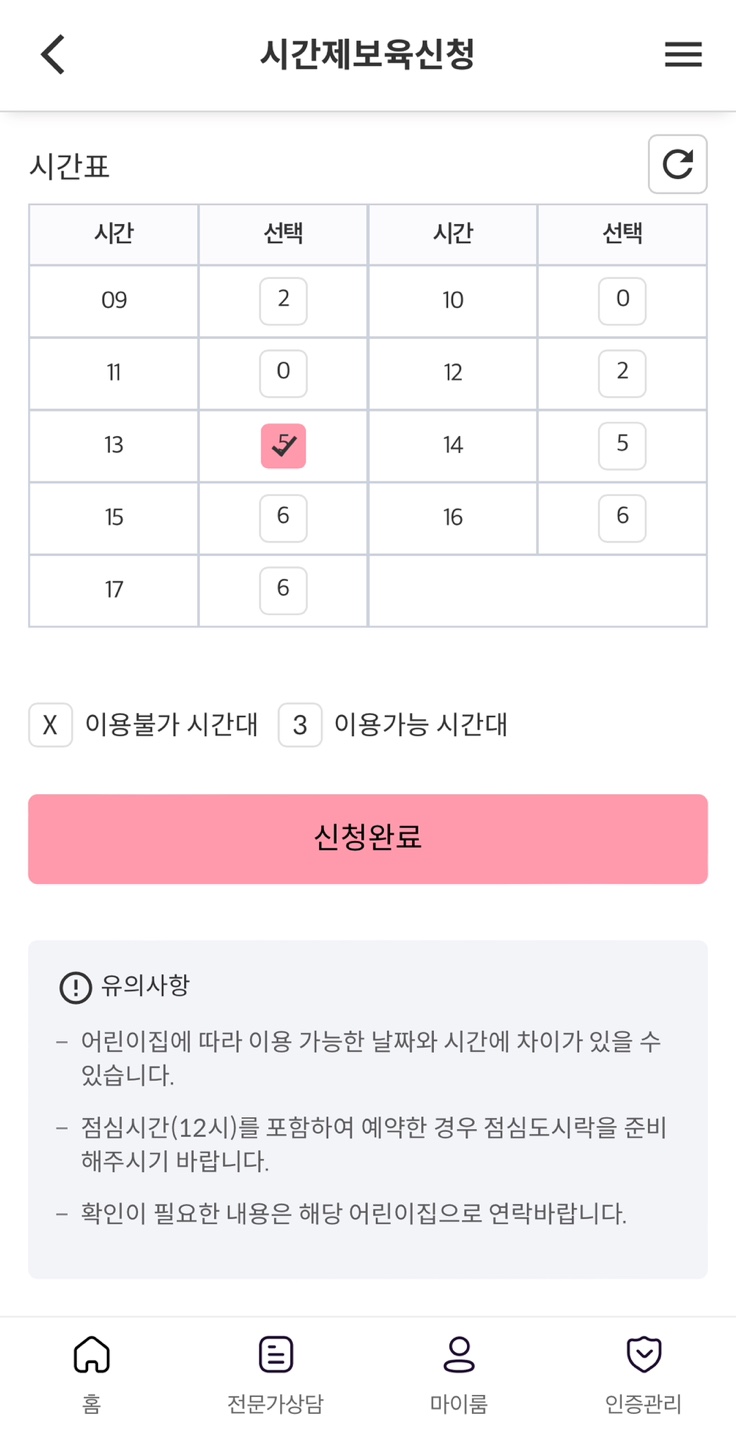 - 시간제 보육 신청을 클릭하여 신청을 완료합니다.