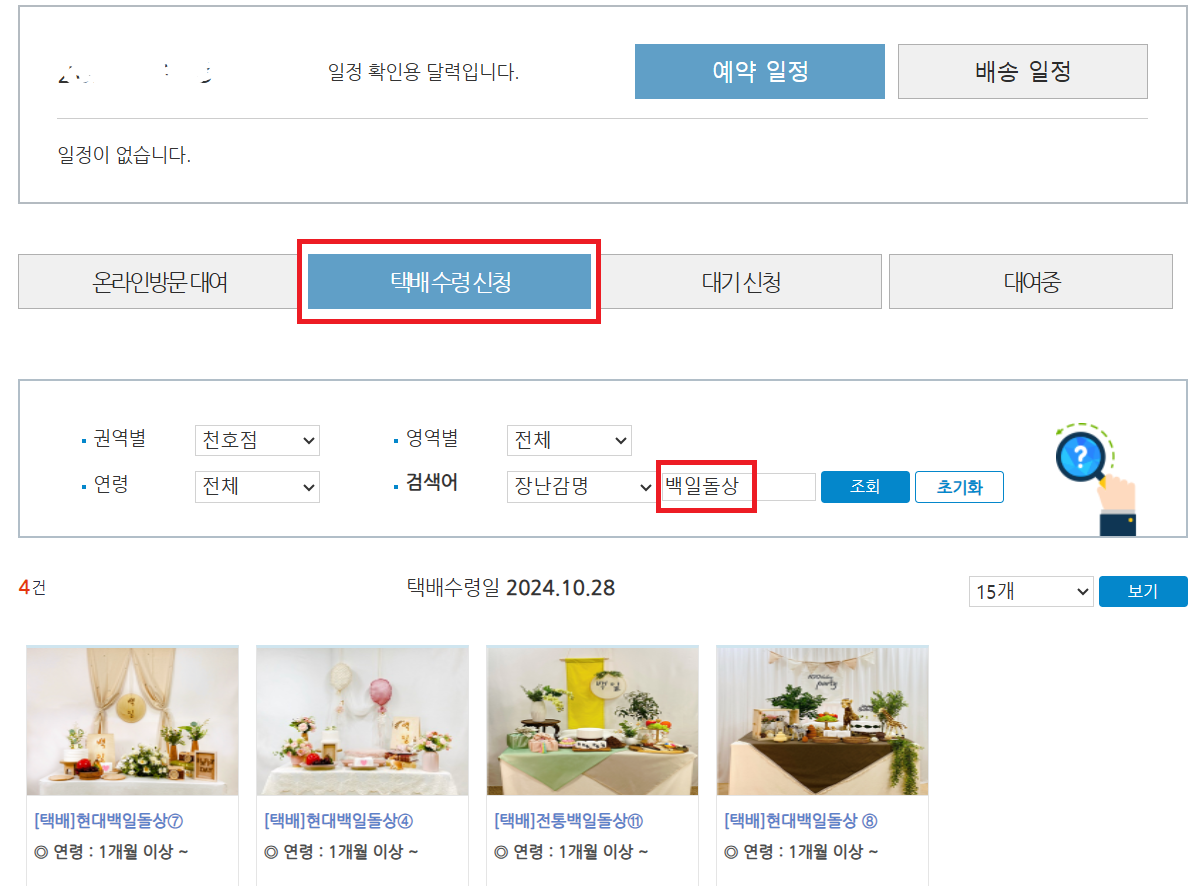 검색창에 "백일돌상"을 입력하고 조회를 누르면 대여 가능한 백일돌상 목록들이 검색되요!!