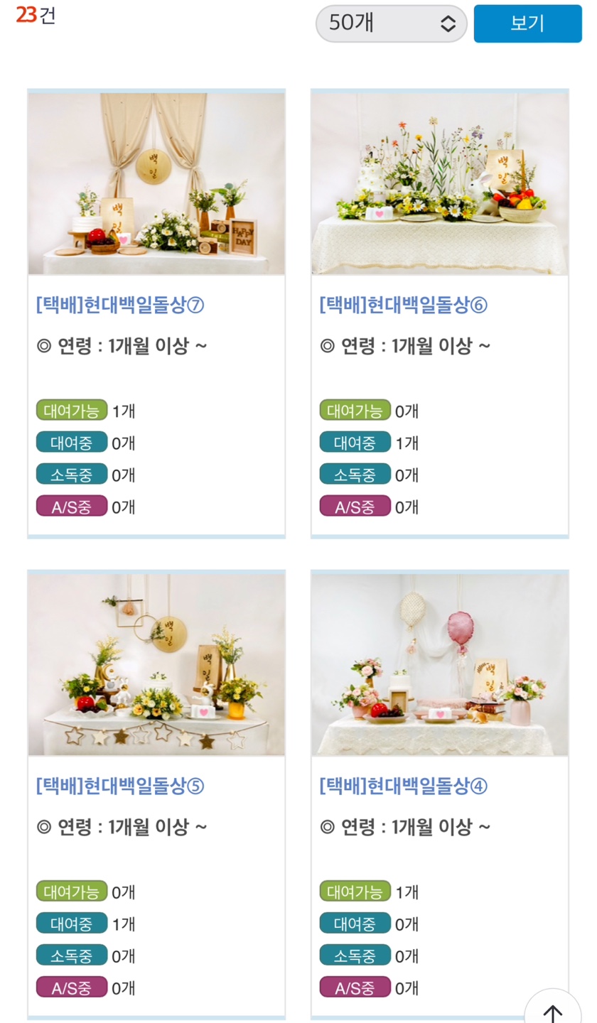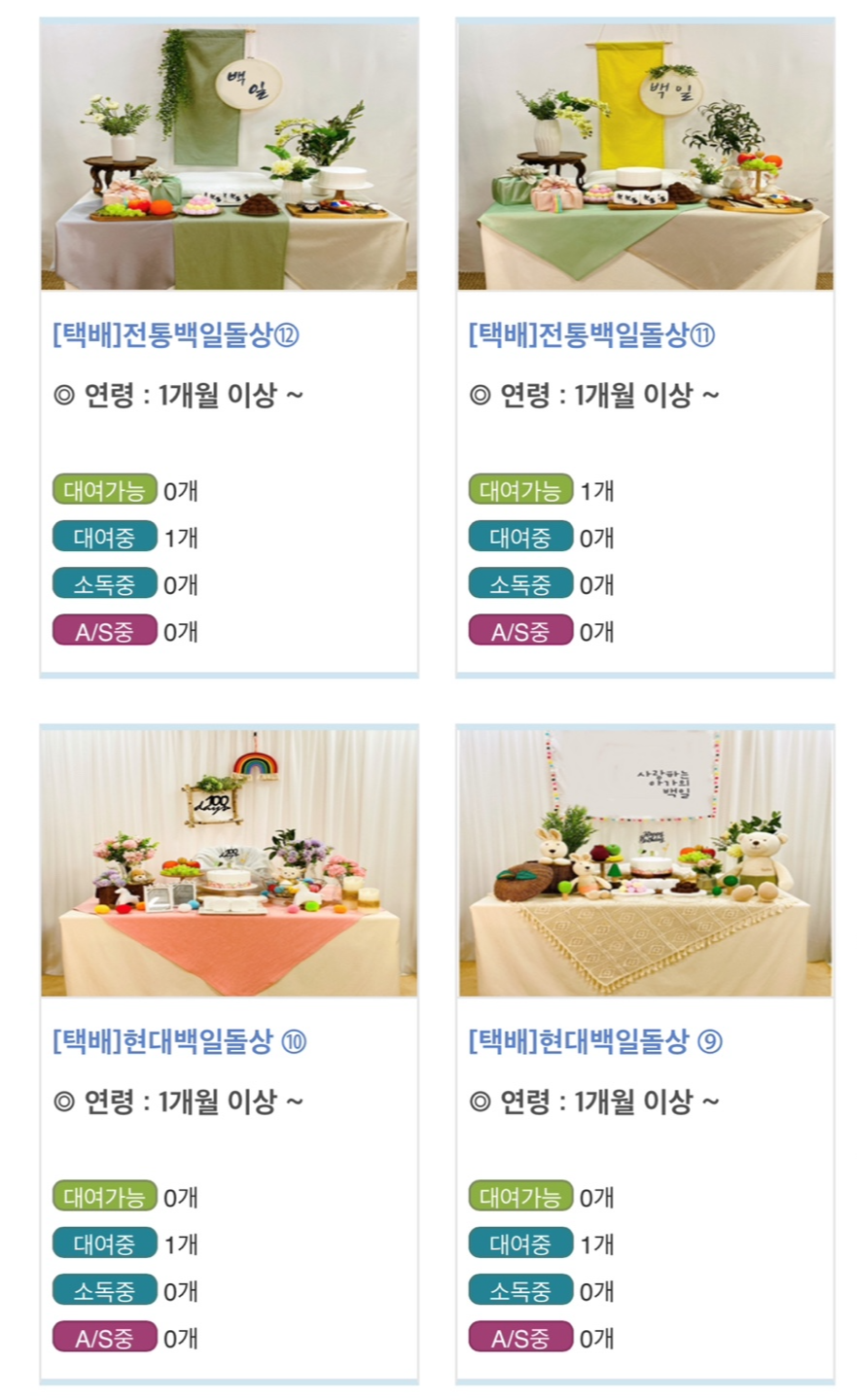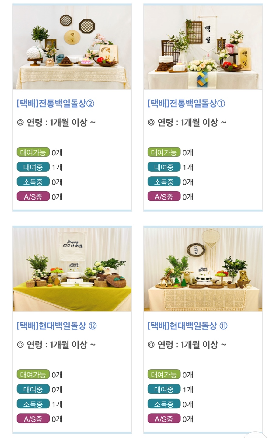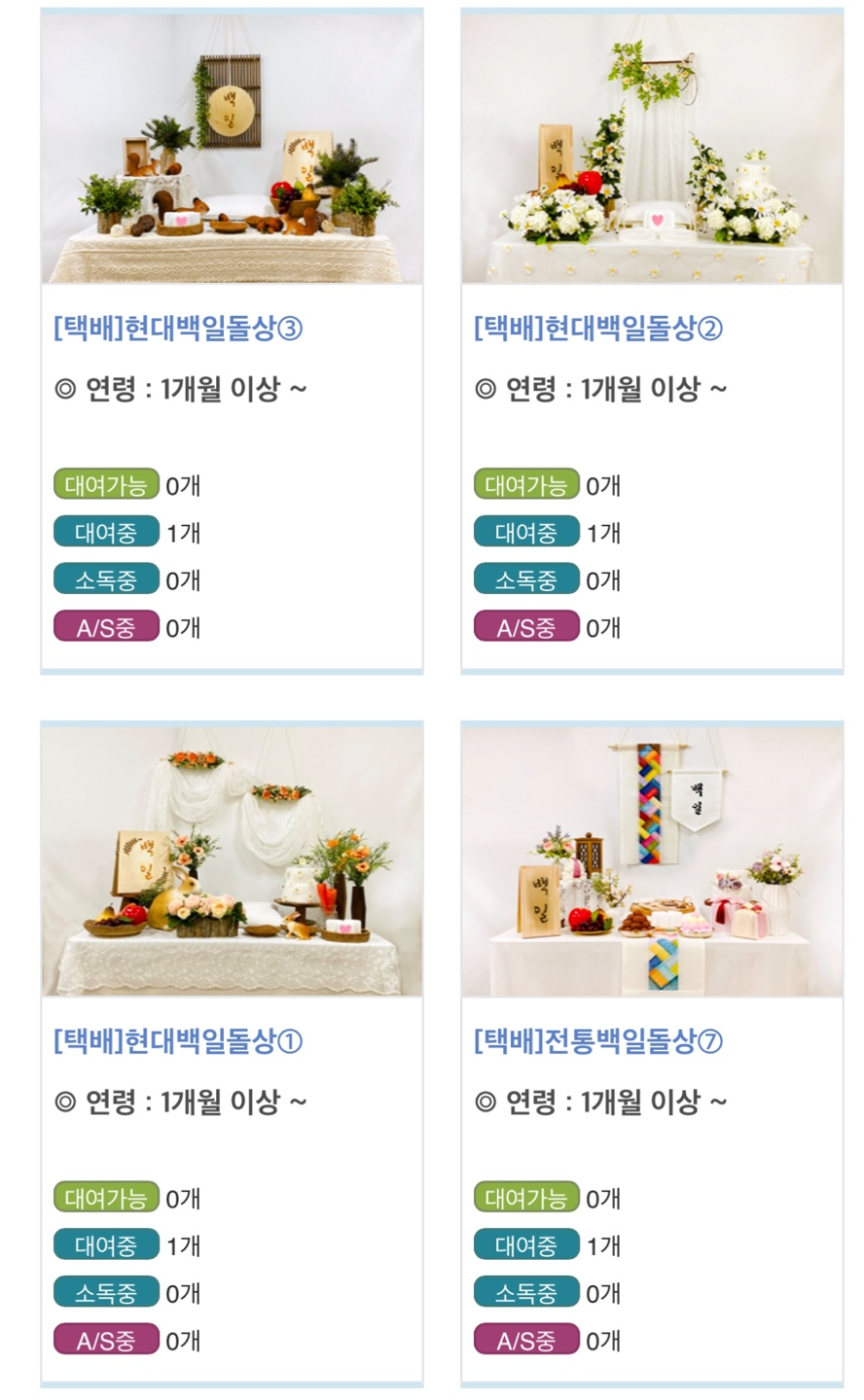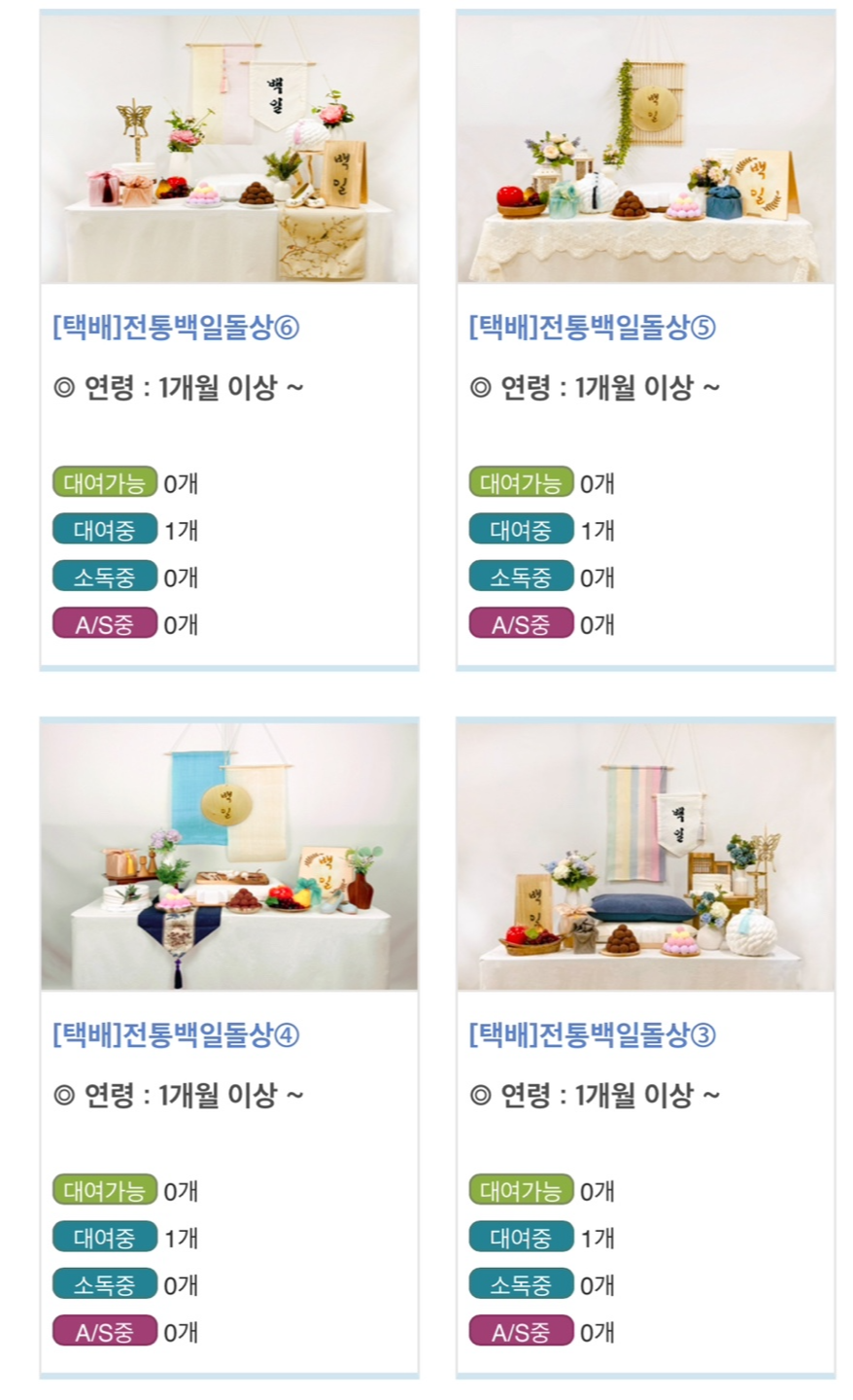 검색창에 "백일돌상"을 입력하고 조회를 누르면 대여 가능한 백일돌상 목록들이 검색되요!!
