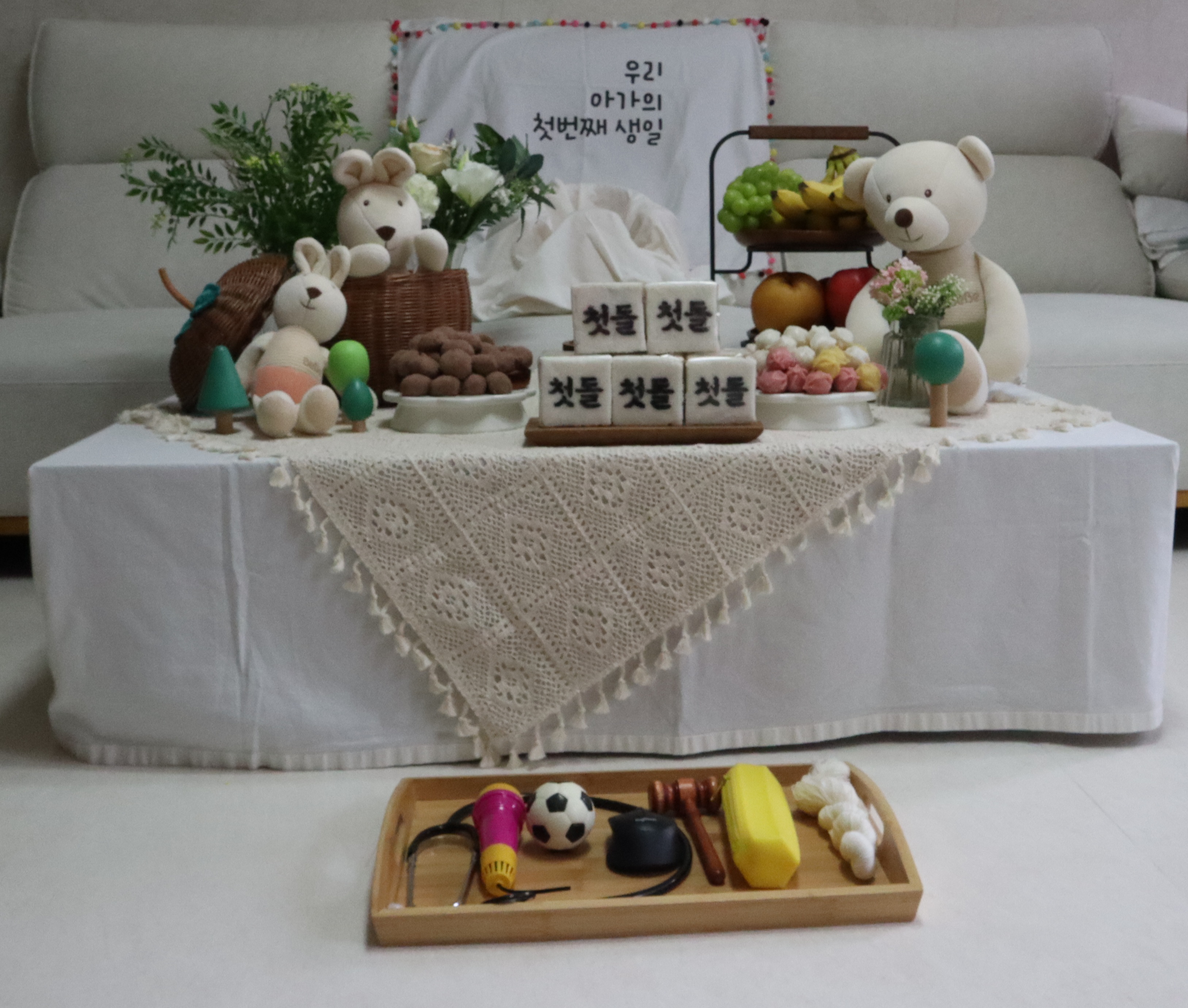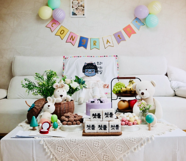 돌상이 꽤나 귀욥쥬~ㅎㅎ 금손 엄빠들은 레터링 풍선이나 소품을 활용해서 좀 더 풍성하게 꾸미시면 정말 예쁠 것 같아요!! 똥손인 저는 가렌더와 풍선만으로 만족해봅니다.