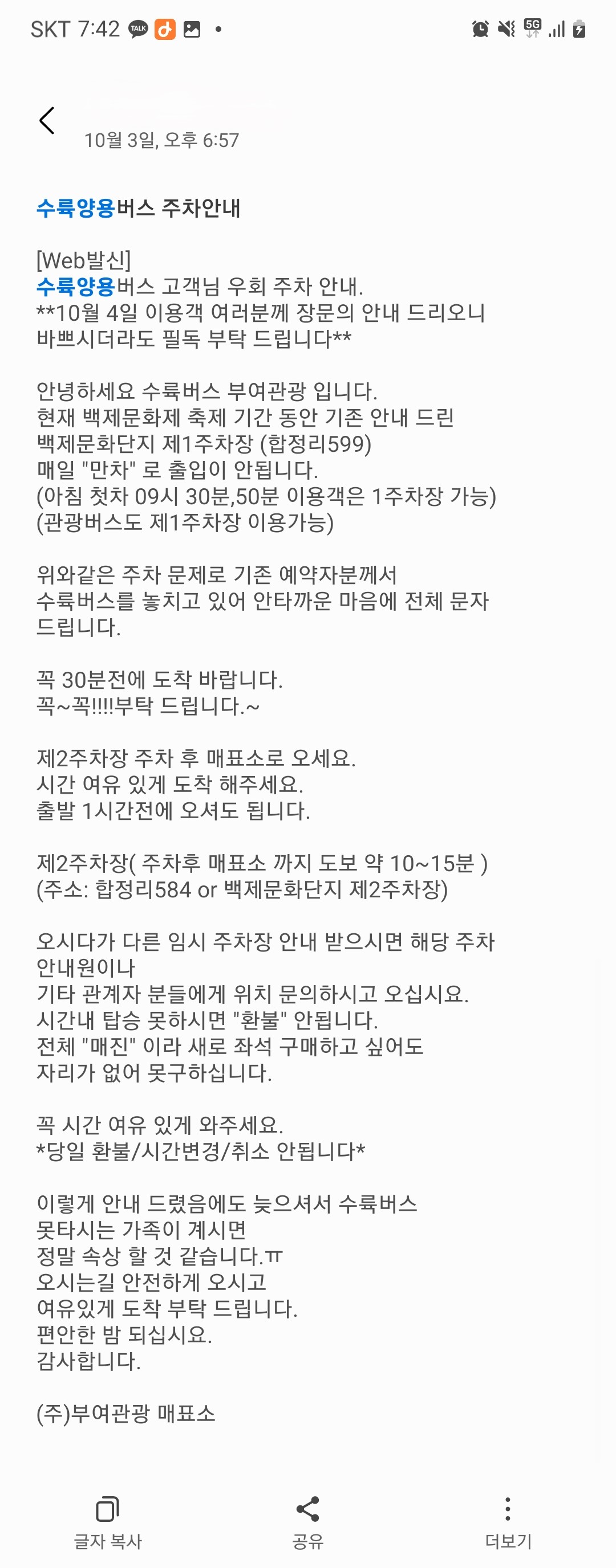 제1주차 만차로 인하여 주차 문제로 예약하신분들이 수륙양용버스를 놓치고 있다는 문자였어요.