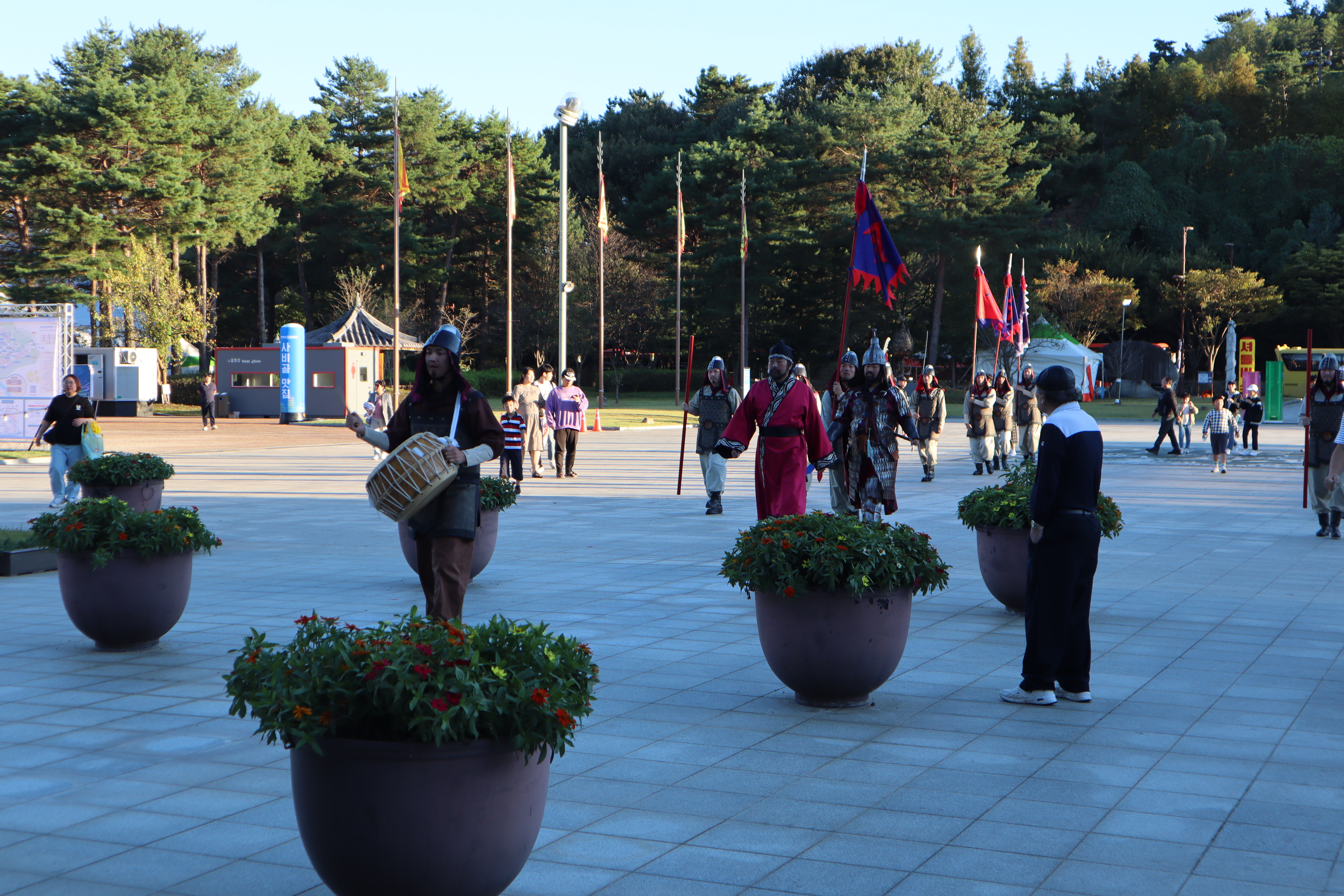퍼레이드는 고대 백제인들이 북을치며 깃발 등 그 시대에 맞는 옷을 입고 왕궁을 한바퀴 돌아 다니는데요. 마치 백제 시대로 시간여행을 떠는 듯한 느낌을 주었어요. 퍼레이드 중간중간 사진을 찍으며 아이들도 굉장히 즐거워했습니다.