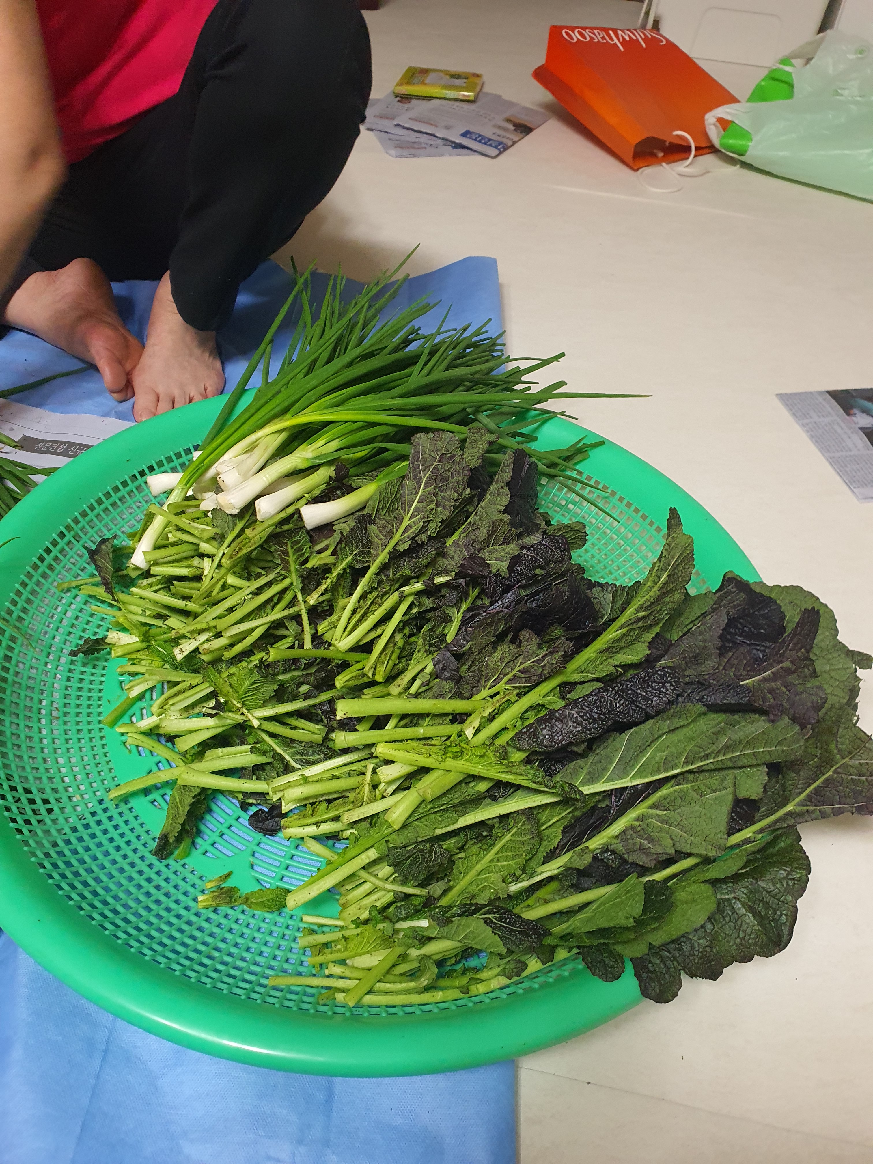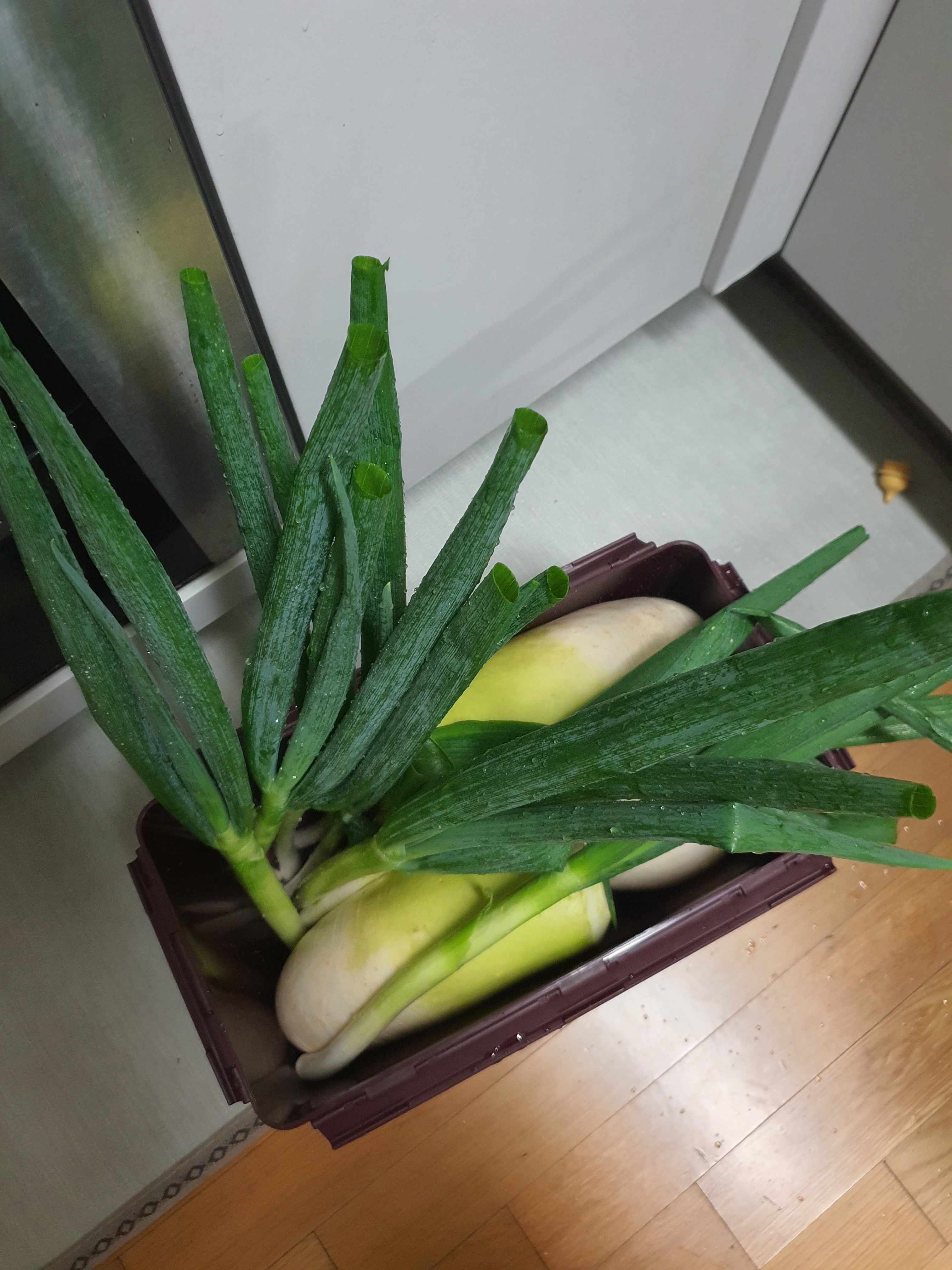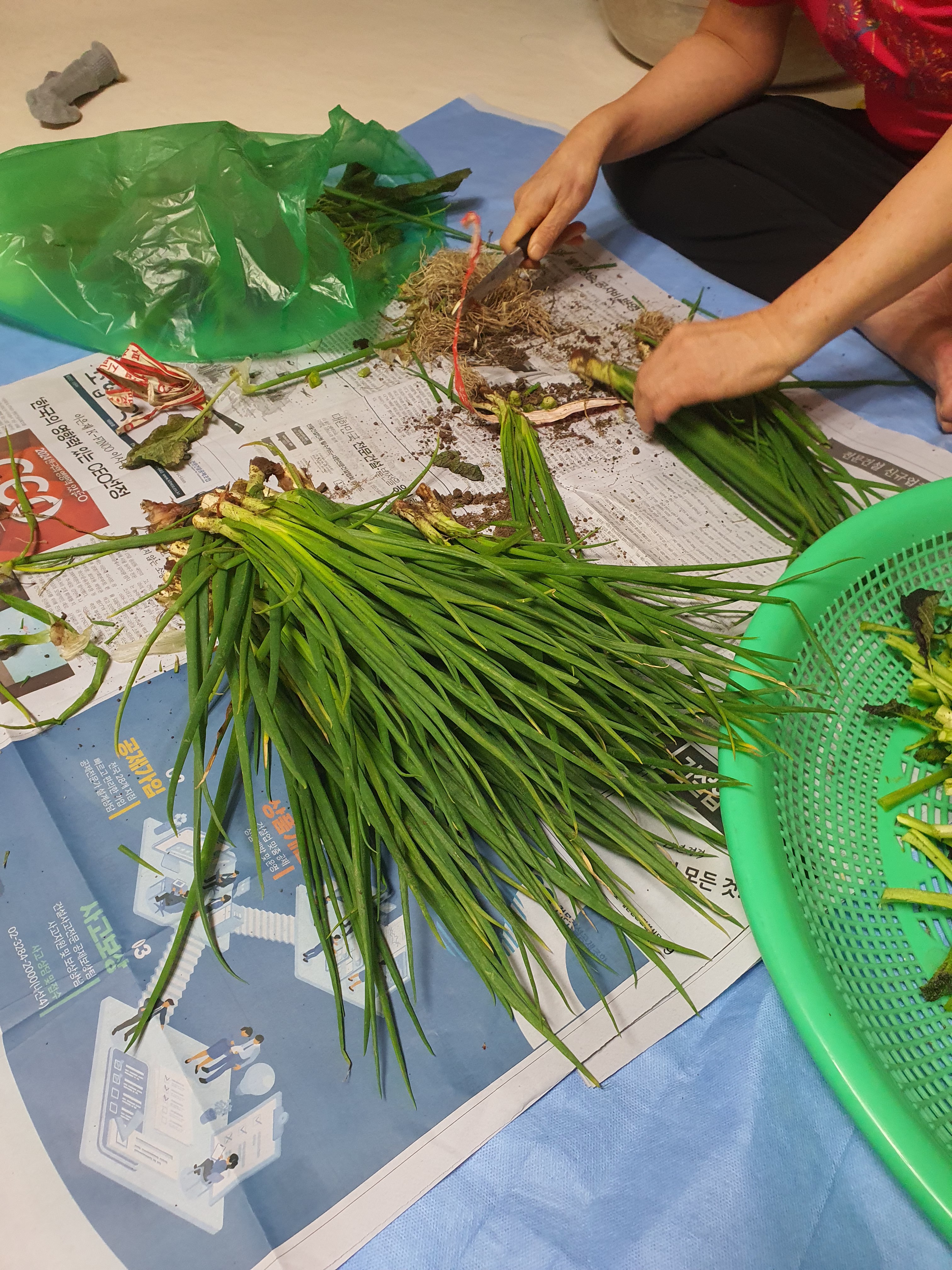 무, 쪽파, 대파 등 다양한 야채들을 정성스럽게 손질합니다.